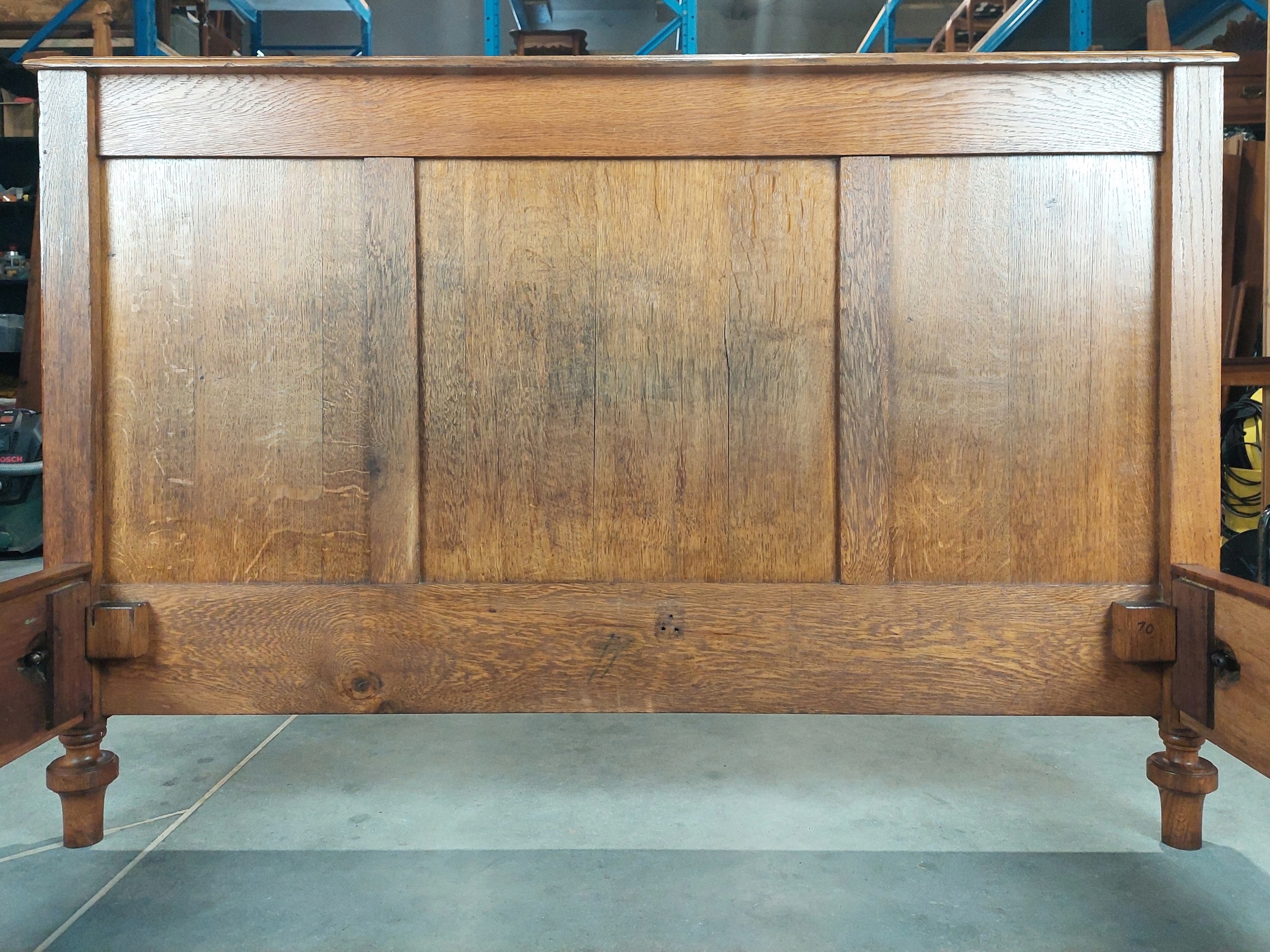 Стильная эклектичная дубовая кровать, привезенная из Франции. Сплошная конструкция, полностью изготовленная из твердого дуба. Есть отметки, такие как царапины обесцвечивания (в основном в ногах изнутри изголовья). Расчетное время восстания - ход 1920/1930 года. )