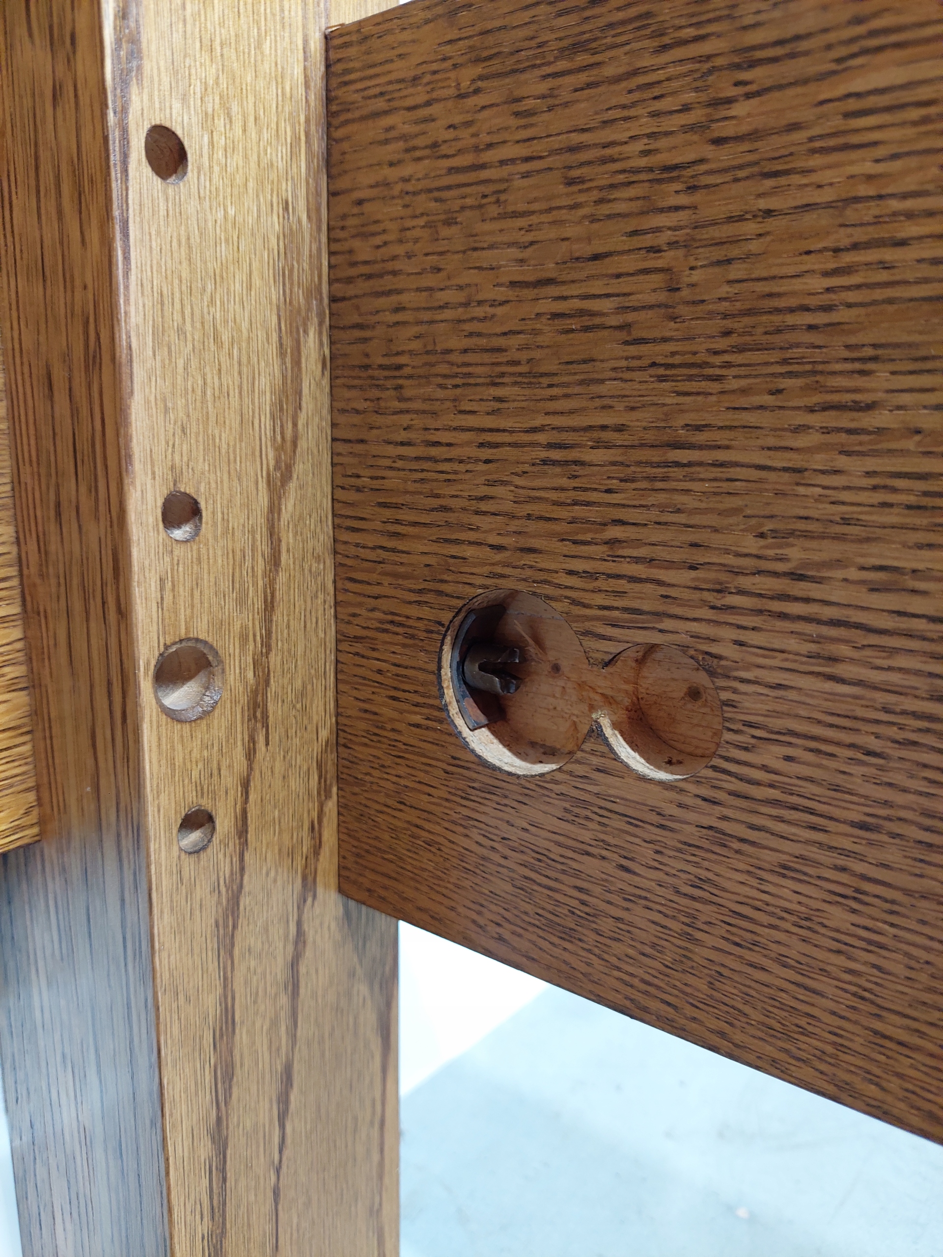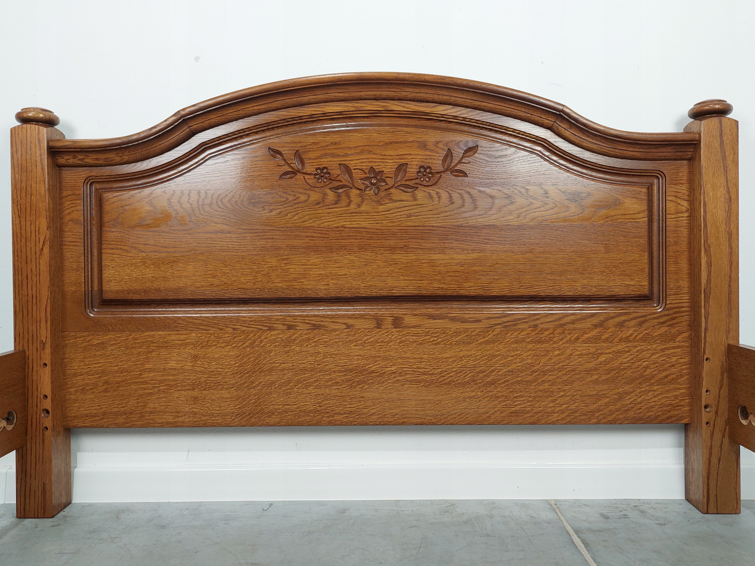 Стильная кровать из голландского дуба, импортированная из Нидерландов. Мебель изготовлена из массива дуба, только боковые планки шпонированы фанерой. Имеются следы использования в виде царапин и небольшого повреждения шпона на правой планке (последнее фото). Детали описаны и показаны на фотографиях.
