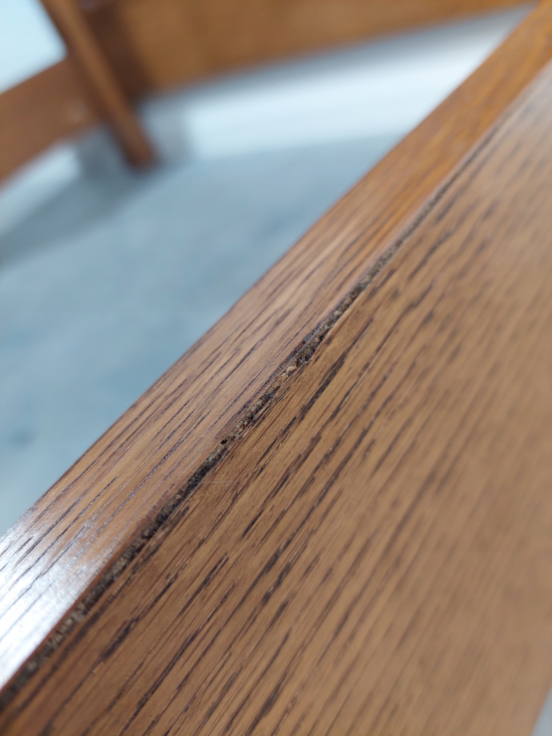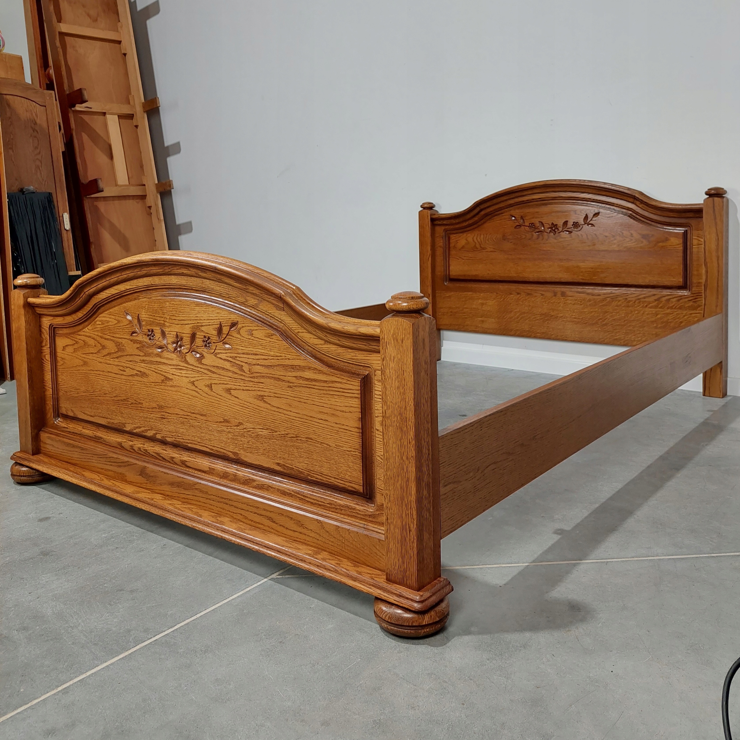 Стильная кровать из голландского дуба, импортированная из Нидерландов. Мебель изготовлена из массива дуба, только боковые планки шпонированы фанерой. Имеются следы использования в виде царапин и небольшого повреждения шпона на правой планке (последнее фото). Детали описаны и показаны на фотографиях.