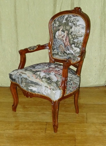 Кресло старинного образца, новое, неиспользованное. Древесина темного ореха. Обивка выполнена из материала гобеленового типа с мотивом придворных фигур. Соединение конструкции с обивкой завершается декоративной латунной шпилькой.