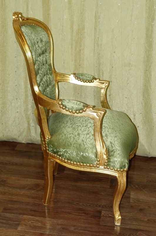 Кресло старинного образца, новое, неиспользованное. Дерево цвета античного золота. Обивка выполнена из зеленого материала с нежным растительным узором. Соединение конструкции с обивкой завершено декоративной застежкой.