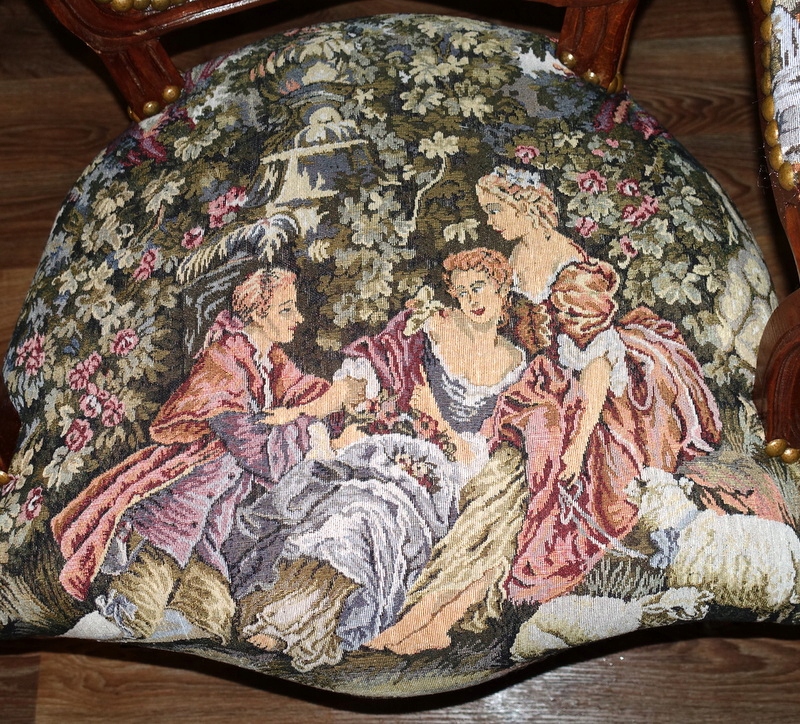 Кресло старинного образца, новое, неиспользованное. Древесина темного ореха. Обивка выполнена из материала гобеленового типа с мотивом придворных фигур. Соединение конструкции с обивкой отделано декоративной латунной шпилькой.