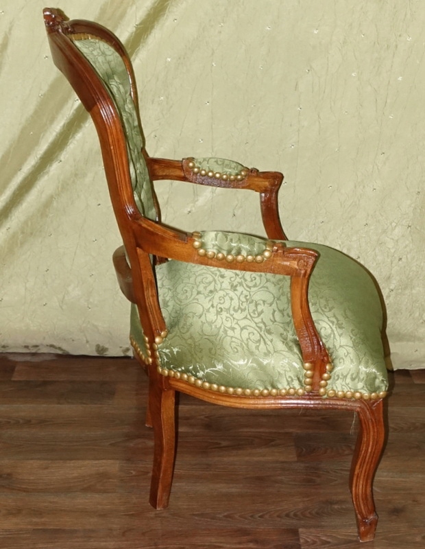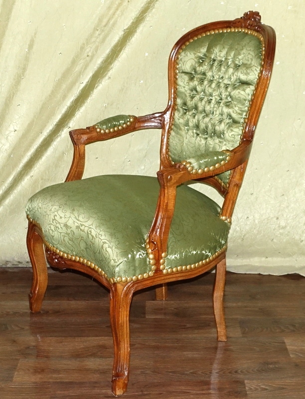 Кресло старинного образца, новое, неиспользованное. Древесина темного ореха. Обивка выполнена из зеленого материала с нежным растительным узором. Соединение конструкции с обивкой завершено декоративной застежкой.