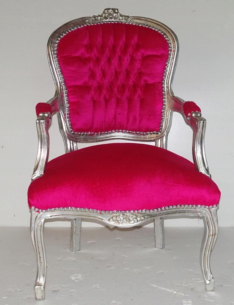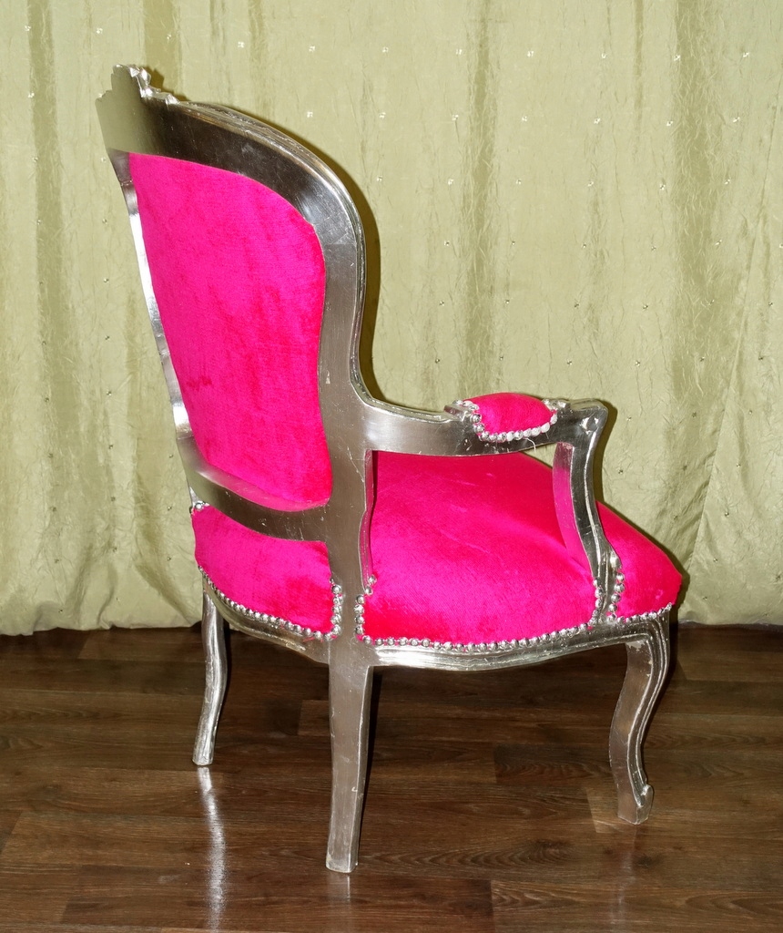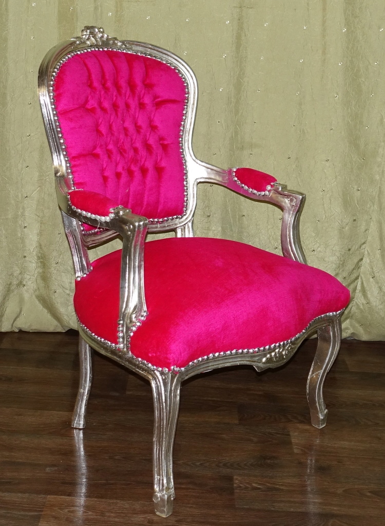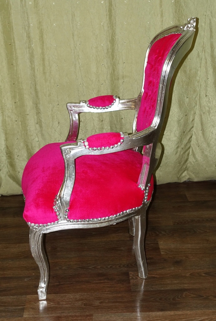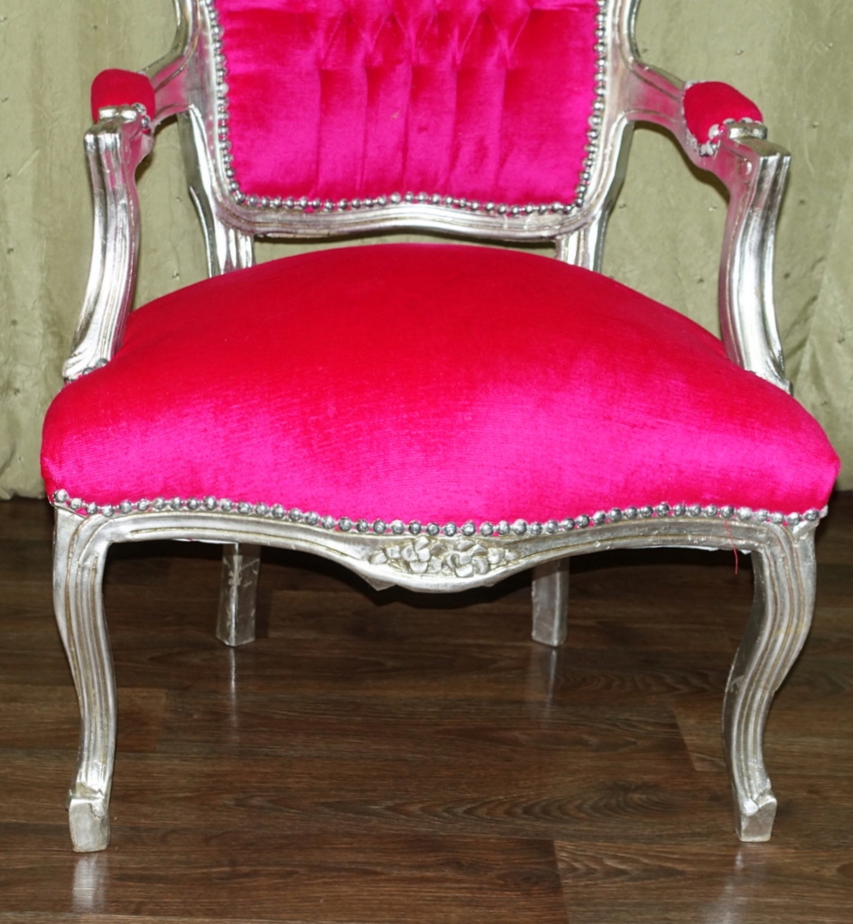 Деревянная конструкция с изящной резьбой в серебре. Обивка выполнена из плюша цвета фуксии, спинка со вкусом простегана, а соединение конструкции с материалом дополнено эстетичной декоративной булавкой. Предмет мебели, сделанный сегодня так, чтобы выглядеть как старинный антикварный предмет.