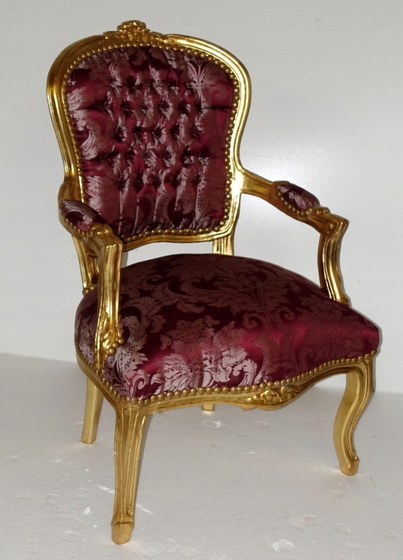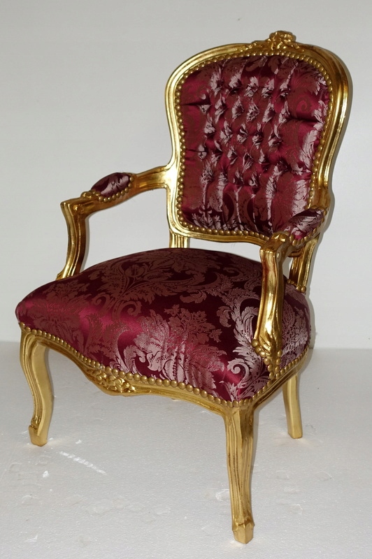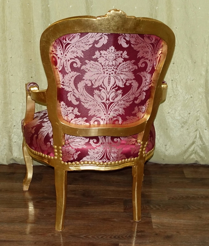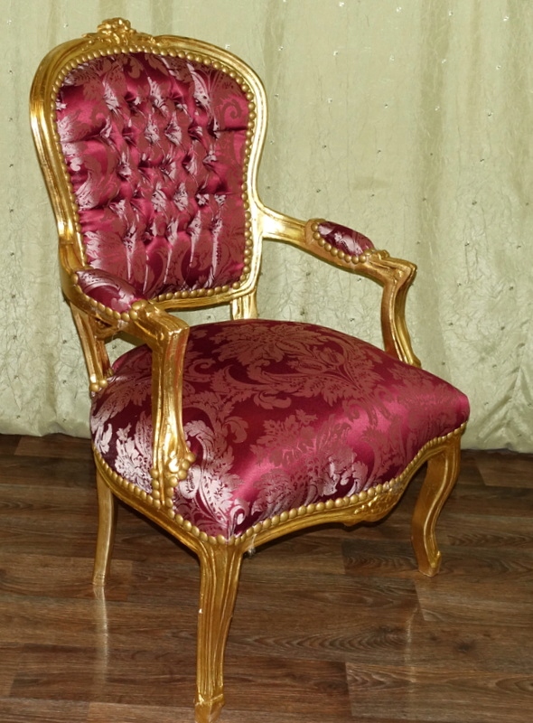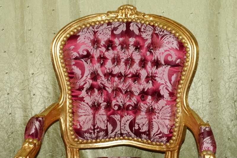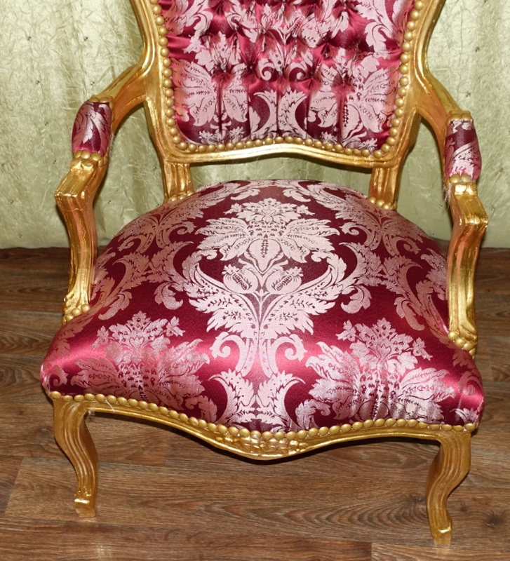 Новый, неиспользованный предмет мебели, выполненный в современном, старинном стиле, выглядящий под старину. Дерево золотого цвета. Обивка из материала бордового цвета с выразительными растительными узорами, переливающимися в зависимости от угла падения света; отделаны изящной латунной булавкой.