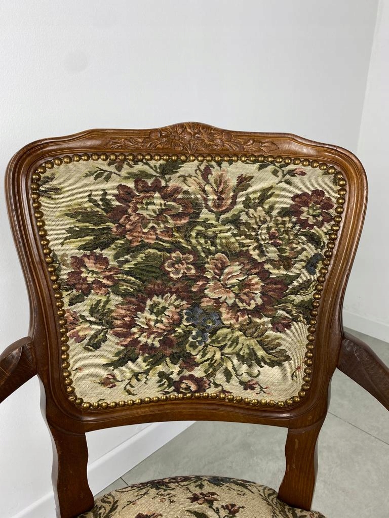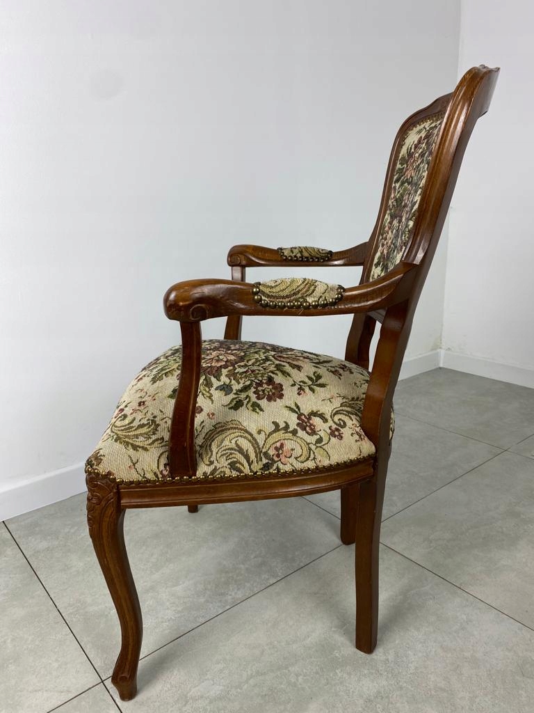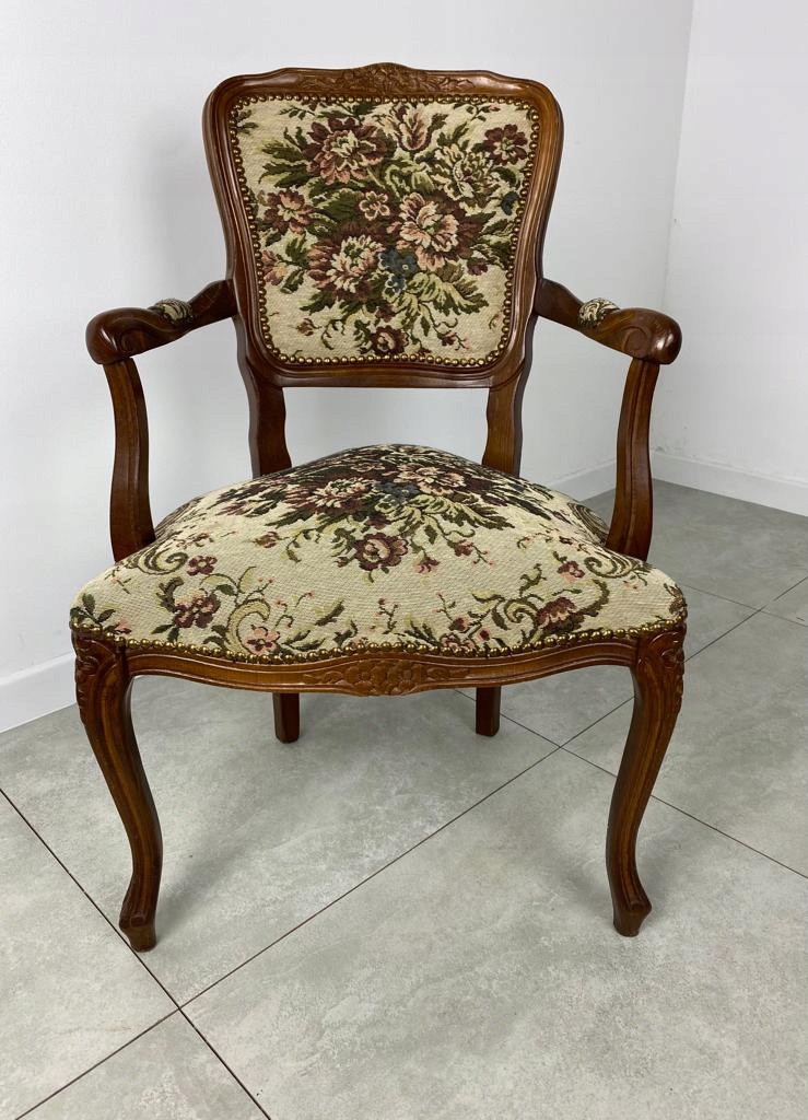 Кресло обито цветочной обивкой, которая находится в очень хорошем первоначальном состоянии.
