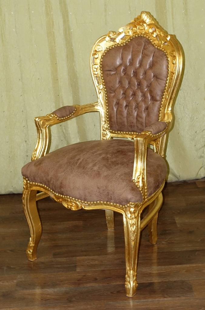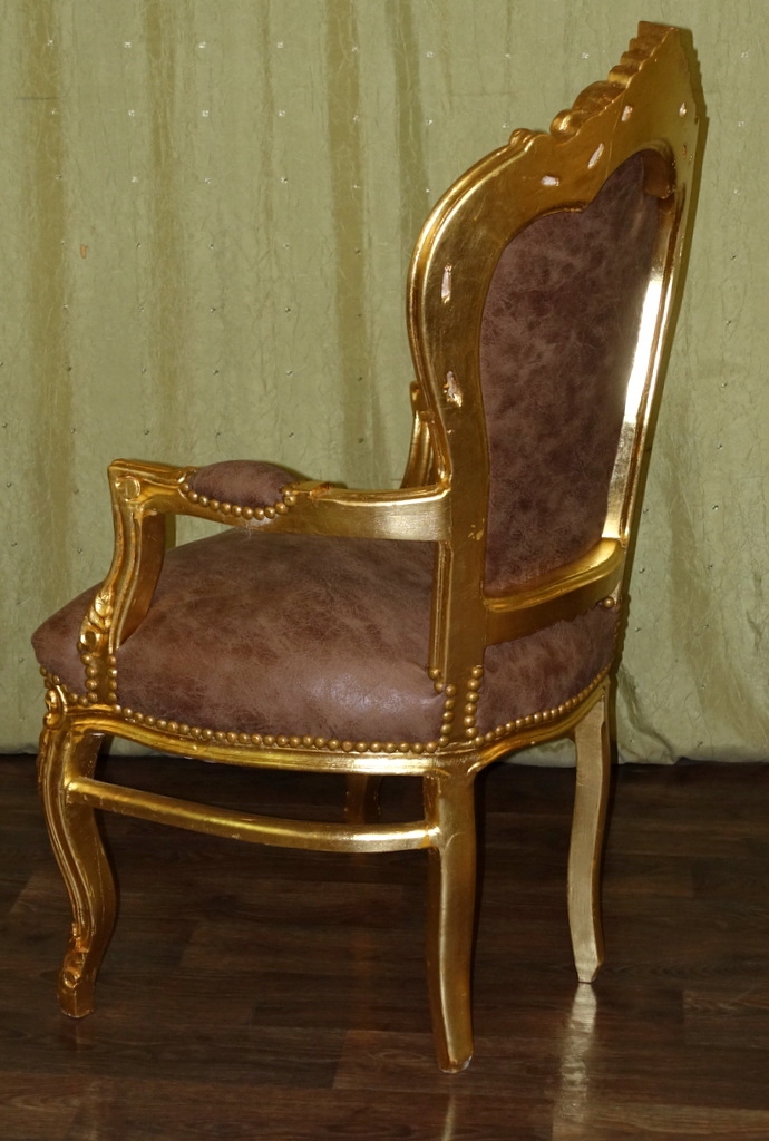 Стильный стул в стиле барокко с подлокотниками. Новая, не бывшая в употреблении мебель, выполненная в современном стиле под старину под старину. Дерево цвета старого золота, обивка из нубука кофейного цвета с нежным меланжем; со вкусом простегана на спинке.