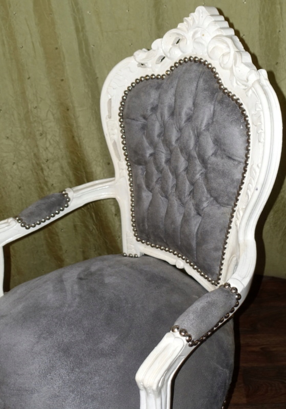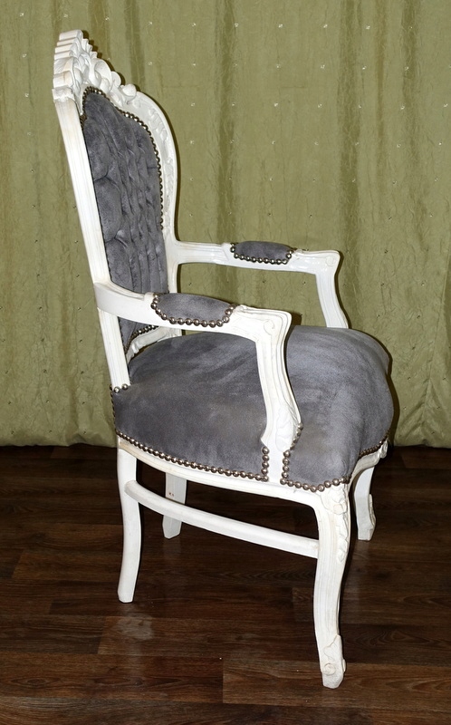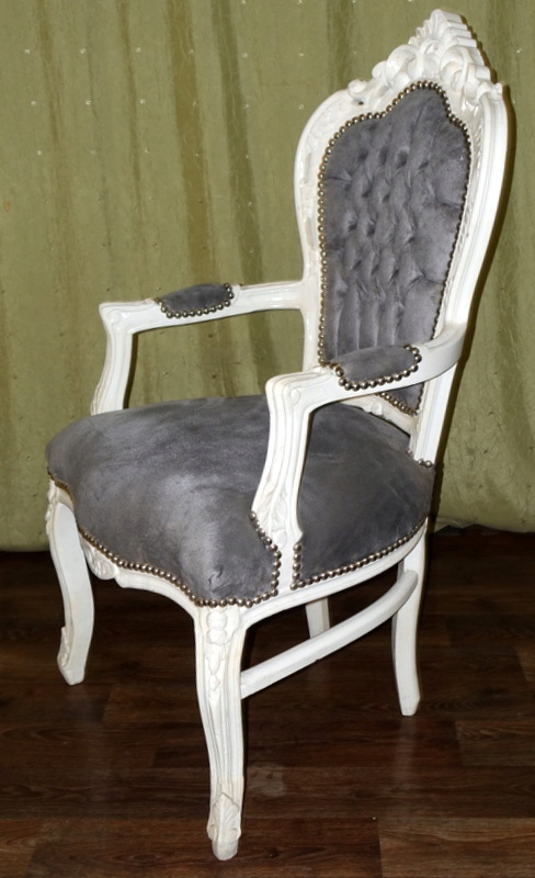 Стильный стул в стиле барокко с подлокотниками. Новая, не бывшая в употреблении мебель, выполненная в современном стиле под старину под старину. Дерево античного белого цвета. Серая обивка, плюшевый материал - со вкусом простегана спинка.
