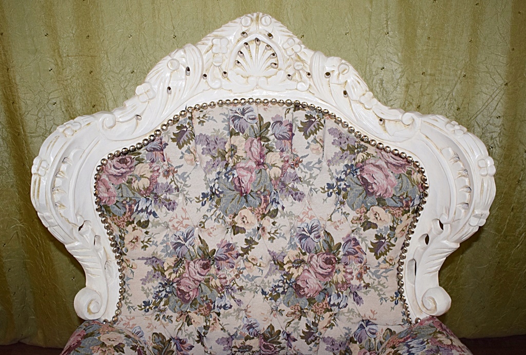Кресло в стиле барокко, деревянная конструкция, как и подобает этому стилю, богато украшена резьбой в античном белом цвете. Обивка из гобеленового материала – цветочный мотив; спинка со вкусом простегана, и все это эстетично отделано булавкой.