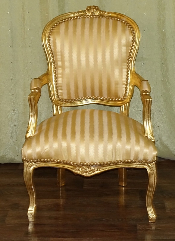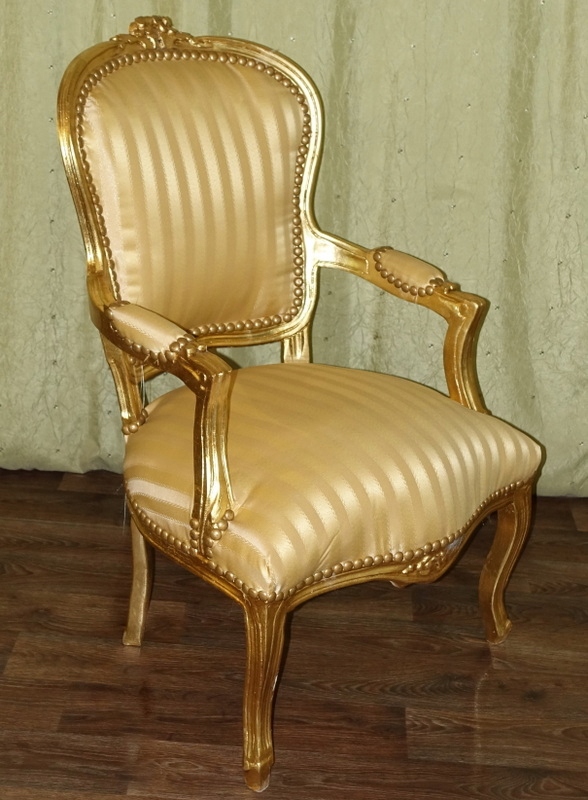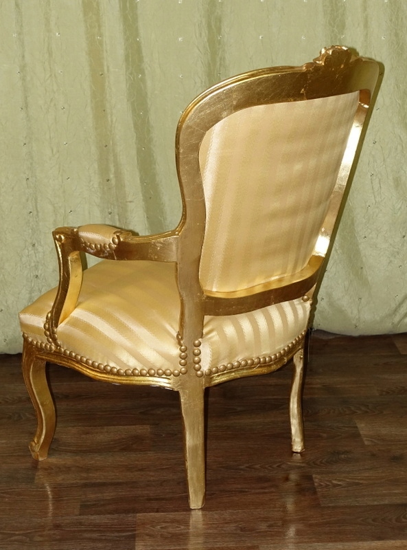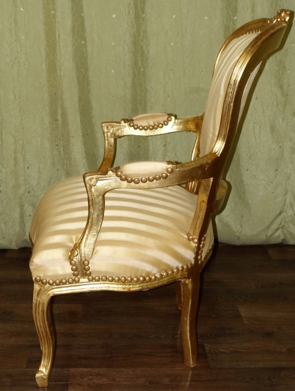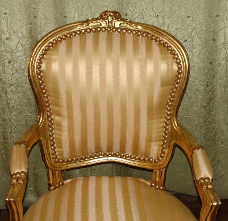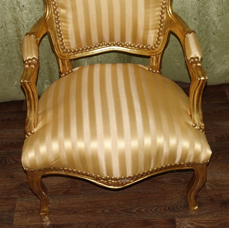 Новый, неиспользованный предмет мебели, выполненный в современном, старинном стиле, выглядящий под старину. Дерево золотого цвета. Обивка выполнена из материала золотистого цвета с медовыми полосками, переливающимися в зависимости от угла падения света; отделаны изящной латунной булавкой.