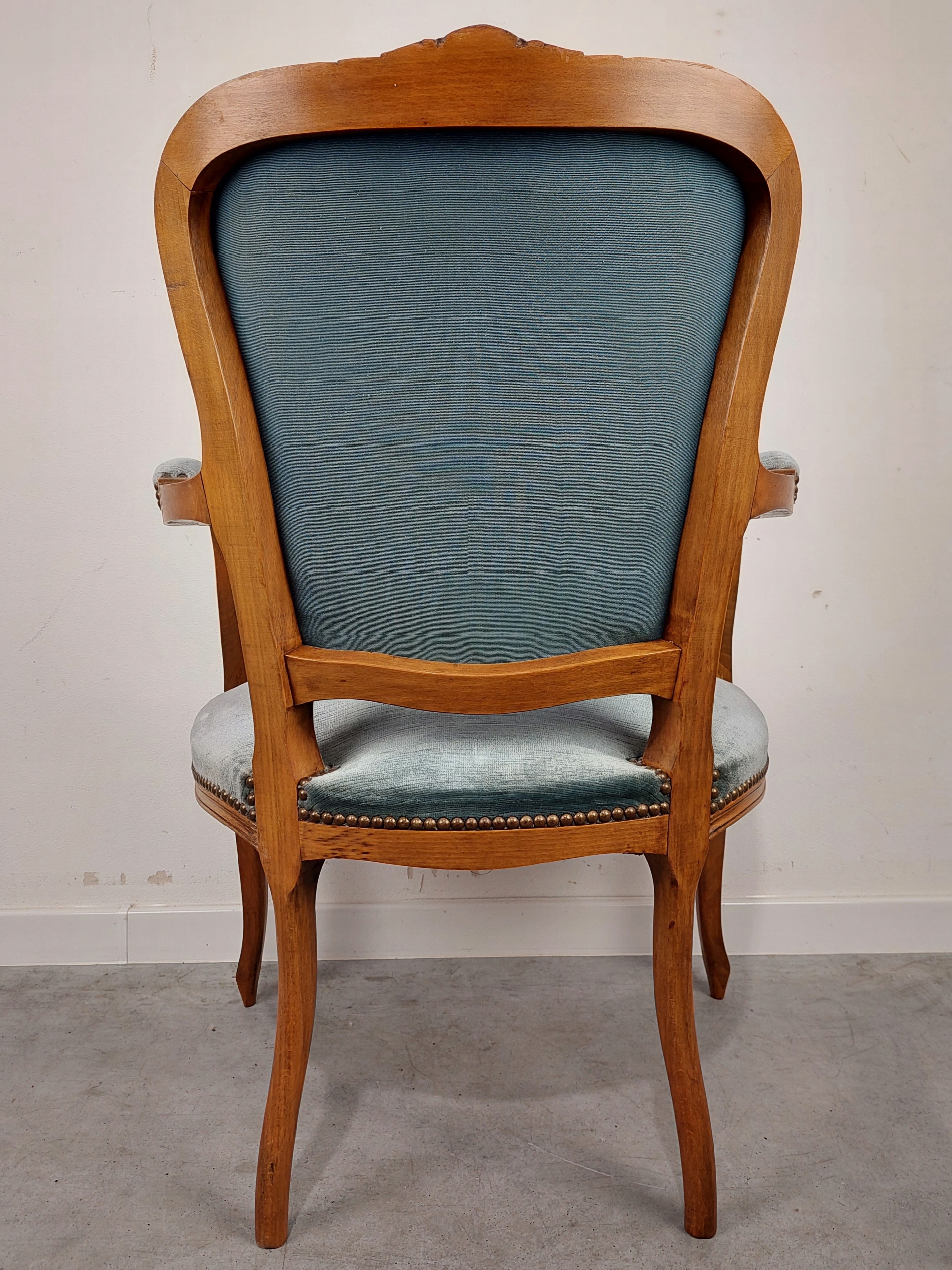 Стильное дубовое кресло Людвик, обитое синим цветом (будто прямиком из серии «Бриджертоны»), установленное на гнутых ножках. Обивка бархат/велюр, без дыр и потертостей, в хорошем состоянии (следы на сиденье - волоски ткани, смятые в обратную сторону). Сиденье на пружинах, поддерживается джутовыми ремнями. Полностью оригинальная, устойчивая конструкция. Редкая, уникальная модель. Мебель имеет типичные следы использования и структурно безупречна. У нас в наличии есть второе двойное кресло, ознакомьтесь с другими нашими предложениями.