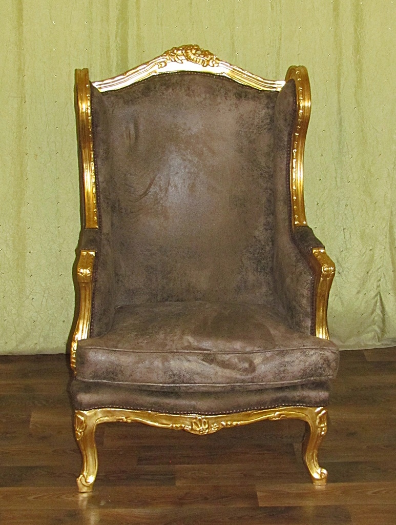 Выставленный предмет мебели представляет собой современную копию прекрасной формы и стиля - новую, не бывшую в употреблении. Дерево с изысканной, нежной золотой резьбой. Материал нубук коричневого цвета. Все идеально сочетается друг с другом, создавая желаемый конечный результат. Идеальное кресло для минут отдыха.