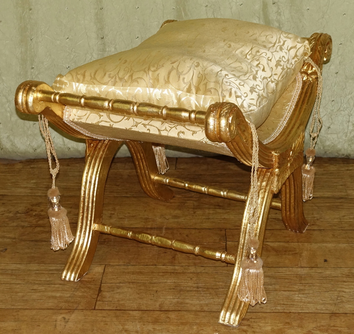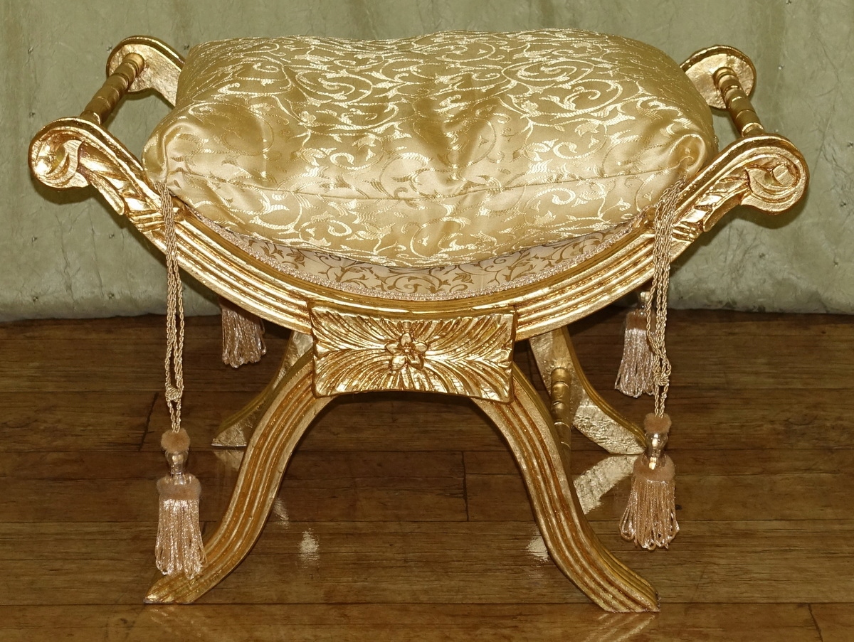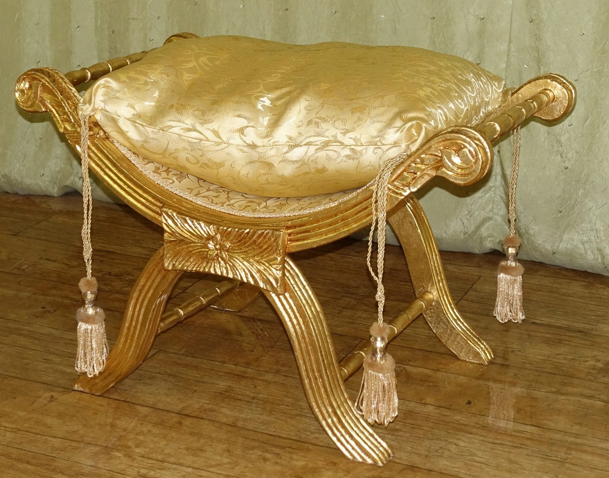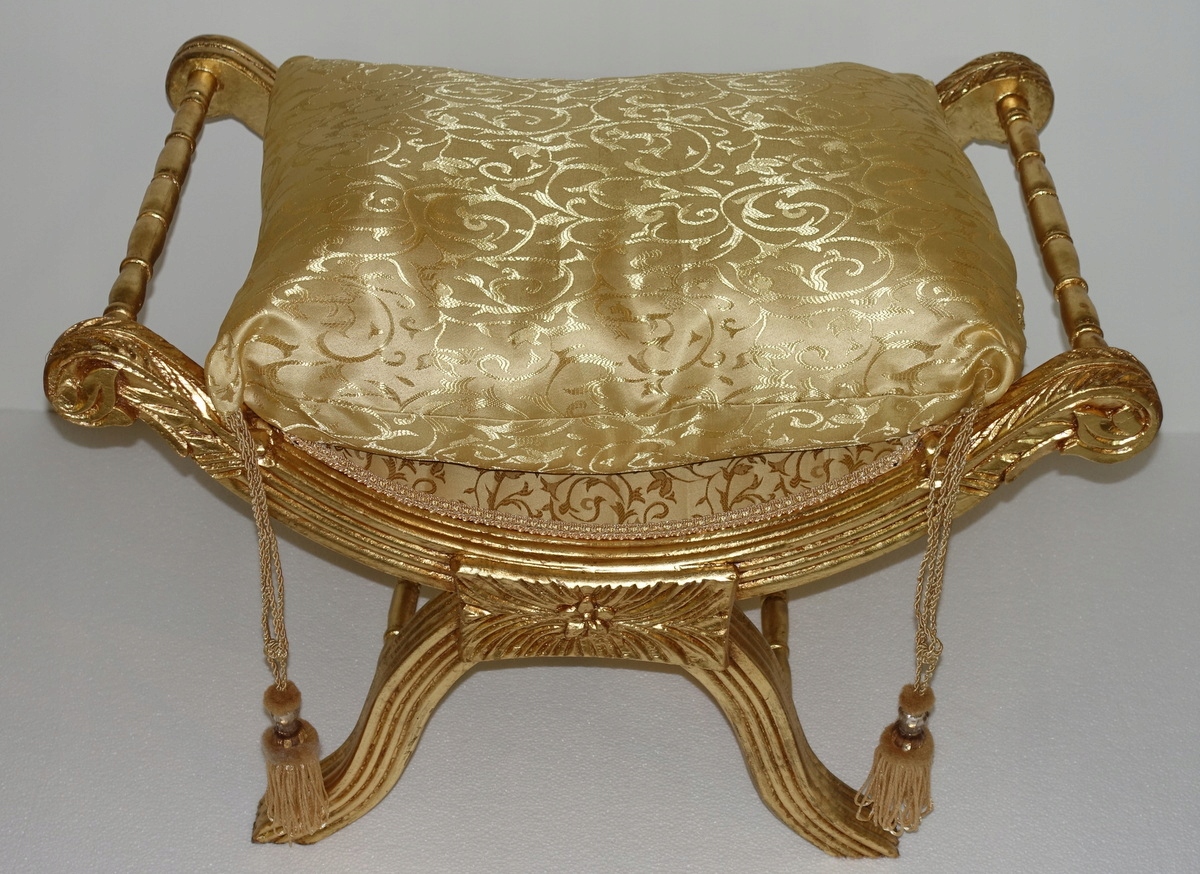 Стильный зиделек - сиденье, выполненное в современном стиле. Деревянная мебельная конструкция, тонко вырезанная по всей поверхности золотом. Подушка изготовлена из материала золотистого цвета с нежным растительным узором, отделана декоративной бахромой по углам. Его можно использовать в качестве сиденья в прихожей при переобувании, в ванной при пользовании туалетом или как дополнительное место в гостиной, когда приходит больше гостей.