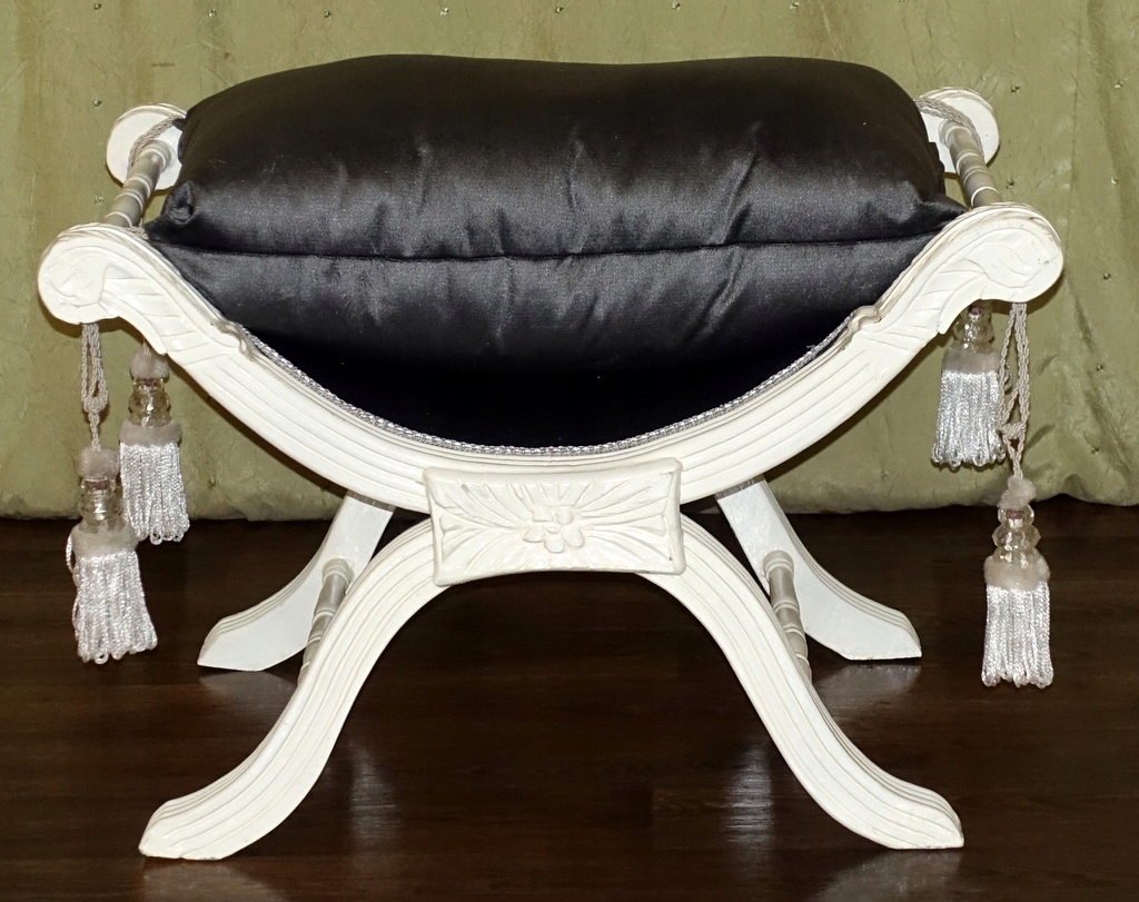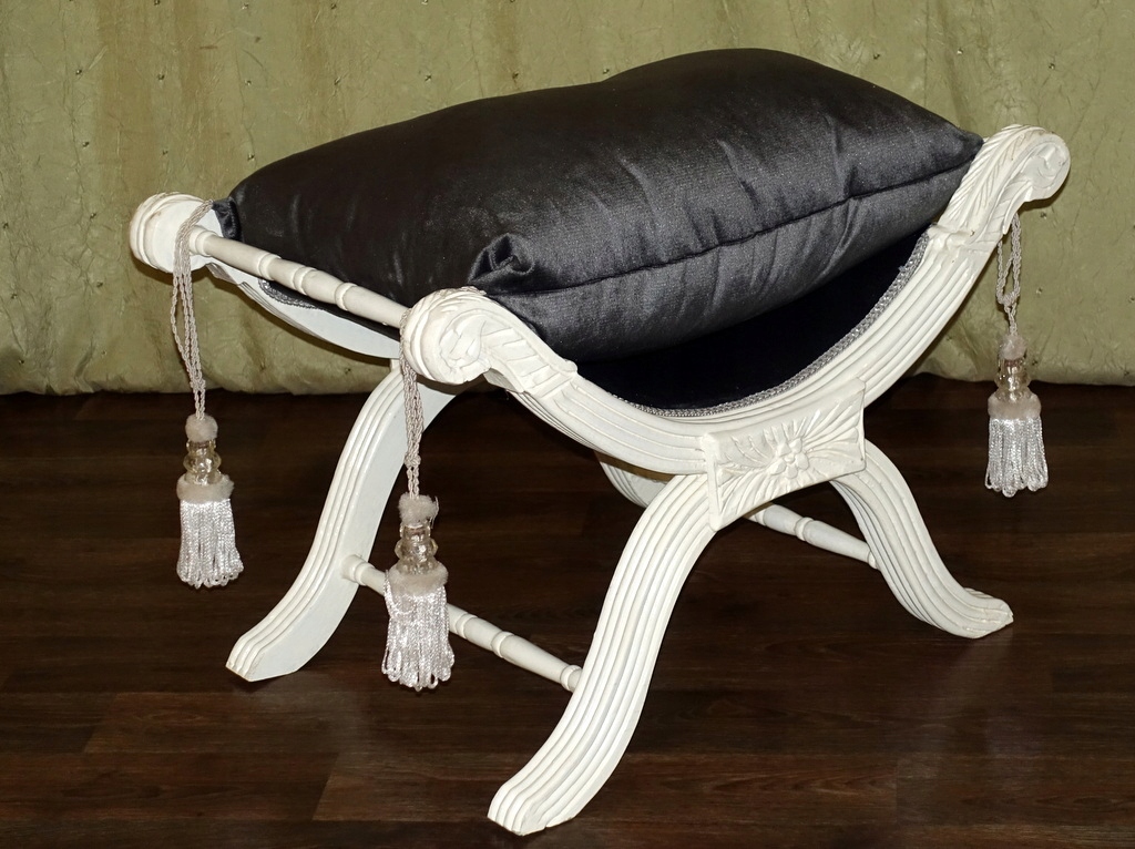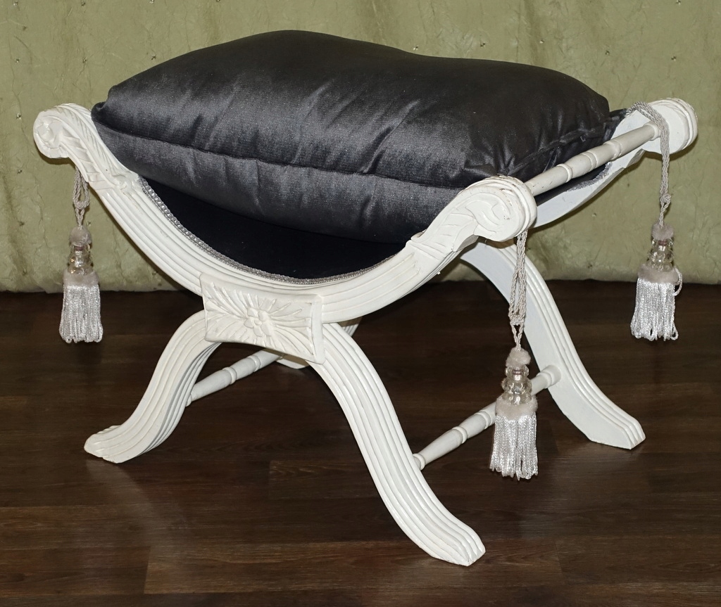 Стильный зиделек - сиденье, выполненное в современном стиле. Деревянная мебельная конструкция с тонкой резьбой по всей поверхности цвета антик-белый. Подушка изготовлена из плюша стального цвета, отделана декоративной бахромой по углам. Его можно использовать в качестве сиденья в прихожей при переобувании, в ванной при пользовании туалетом или как дополнительное место в гостиной, когда приходит больше гостей.