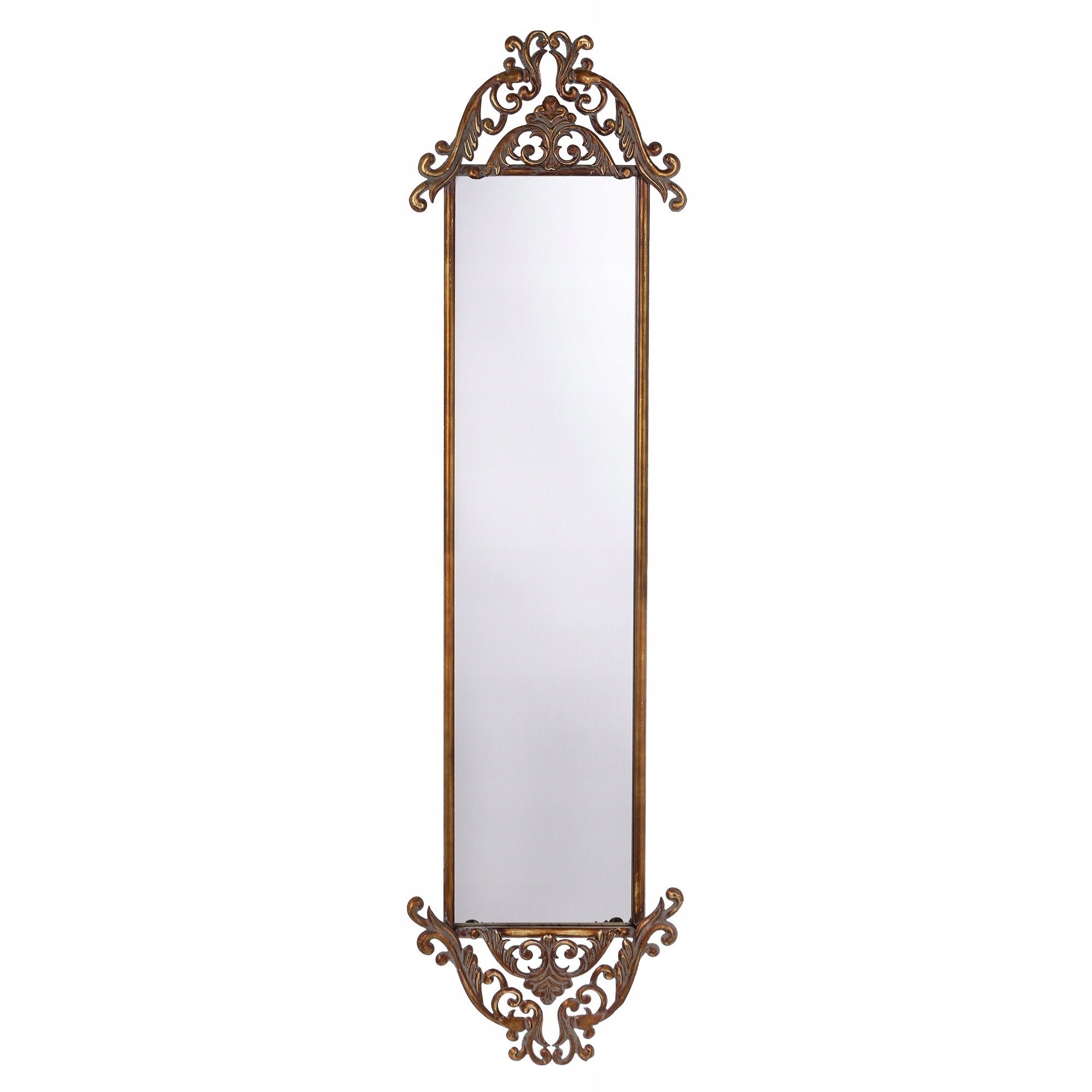 Элегантное зеркало, висящее в узком формате, окружен красивой золотой рамой с древним дизайном. Рамка, богатая в деталях, добавляет характер и глубину любому интерьеру. Благодаря своему универсальному внешнему виду зеркало идеально сочетается как с современными, так и с винтажными композициями. Идеально подходит для подвешивания в коридоре, спальне или гостиной. Продукт прост в установке, поставляется с необходимыми элементами для подвешивания.