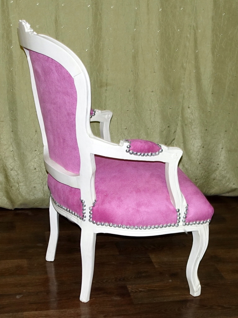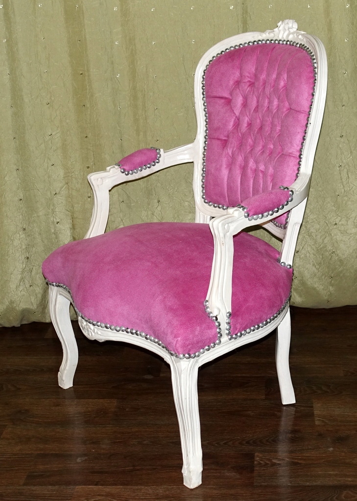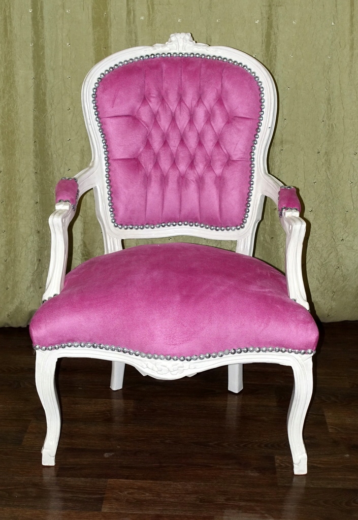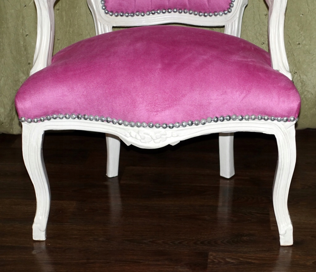 Изящная резная деревянная конструкция античного белого цвета. Обивка выполнена из плюшевого материала розового оттенка, спинка со вкусом простегана, а соединение конструкции и материала завершено эстетичной декоративной булавкой. Предмет мебели, сделанный сегодня так, чтобы выглядеть как старинный антикварный предмет.