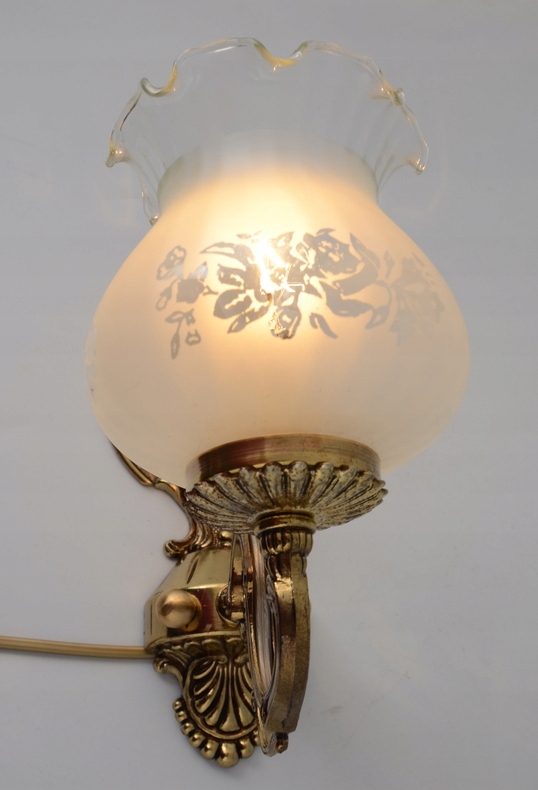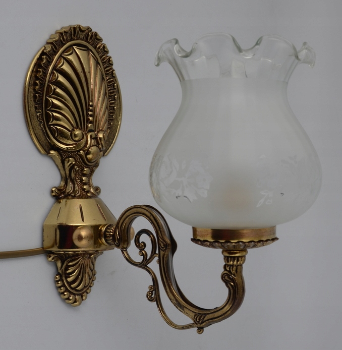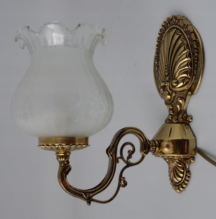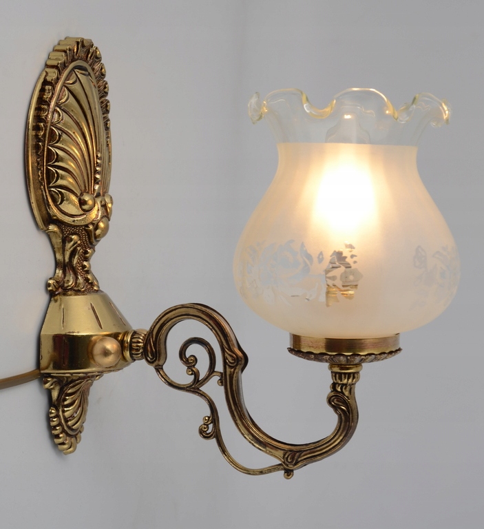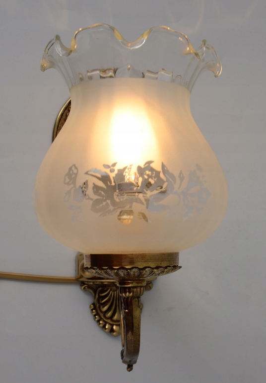 Предметом аукциона является оригинальный, прекрасно выполненный настенный светильник из Испании 1960-х годов. Настенный светильник изготовлен из латуни золотистого цвета. Взор привлекает невероятная точность исполнения и чудесное декорирование. Настенный светильник сделан очень добротно. Обращает на себя внимание абажур изделия, выполненный из молочного стекла с узорами, дополнительным украшением абажура является отделка в виде тонкой рюши. Преимуществом набора является чудесно оформленная настенная часть. Настенный светильник будет уникально смотреться в любом интерьере. Однозначно рекомендую!!!!