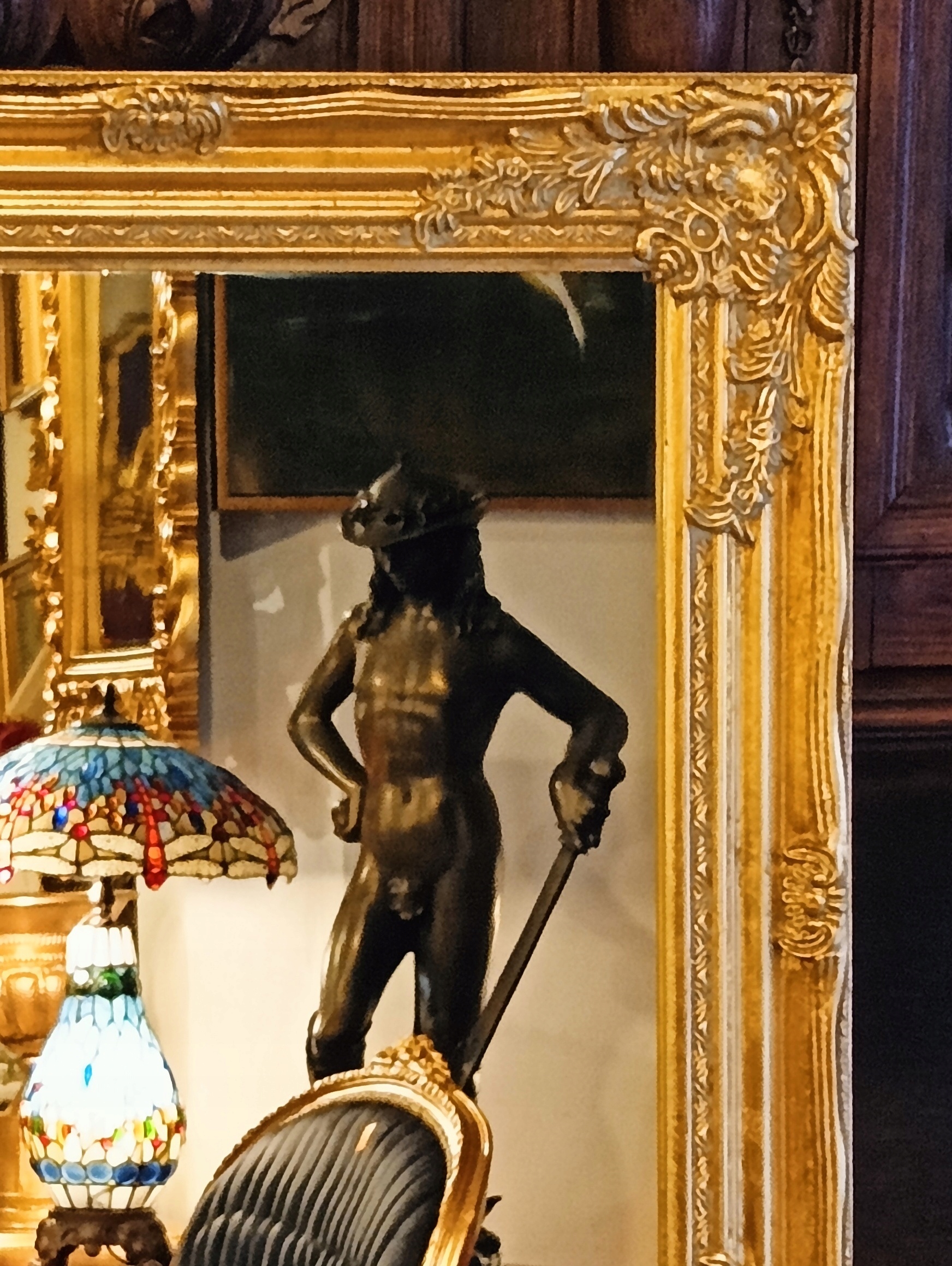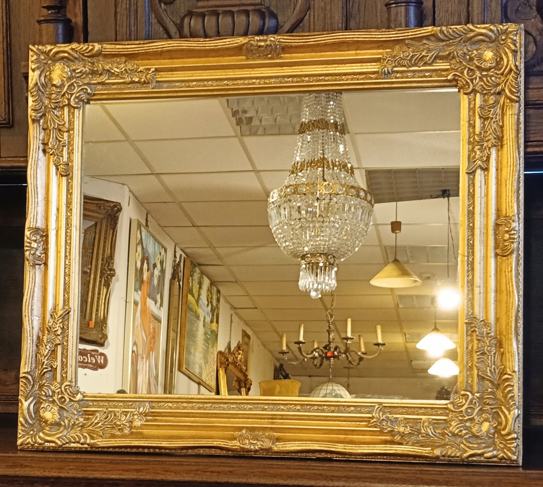 Стильное зеркало h1> красивое и эффективное зеркало в прекрасной деревянной раме цвета старого золота, украшенного деликатными декорами. Они наслаждаются своей изощренностью и оригинальностью. Зеркало может быть подвешено вертикально и горизонтально. Я оцениваю состояние как очень хорошее. h1>