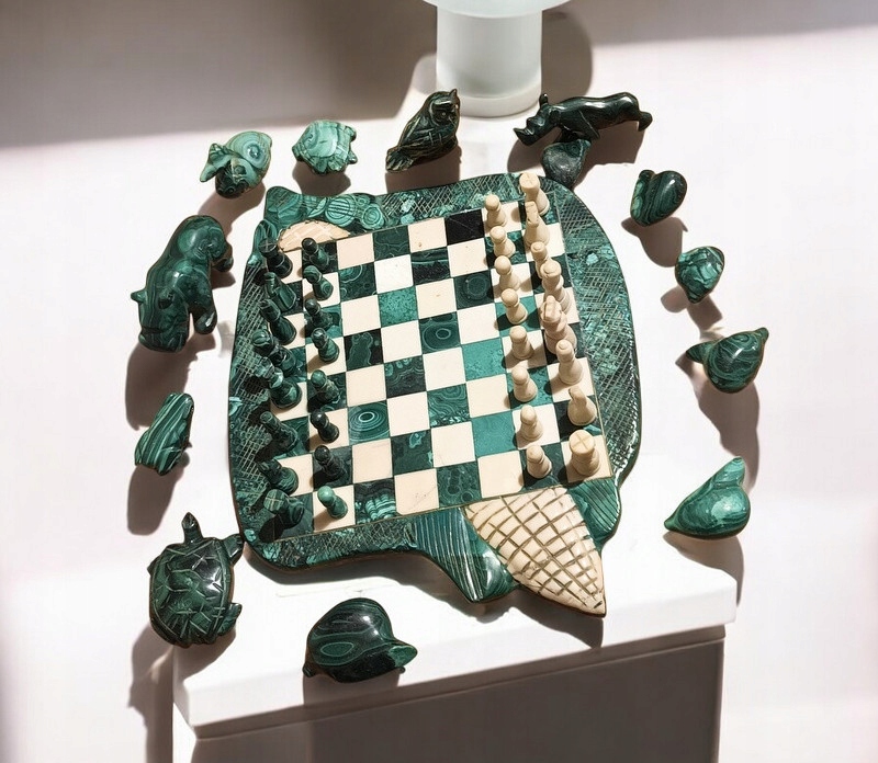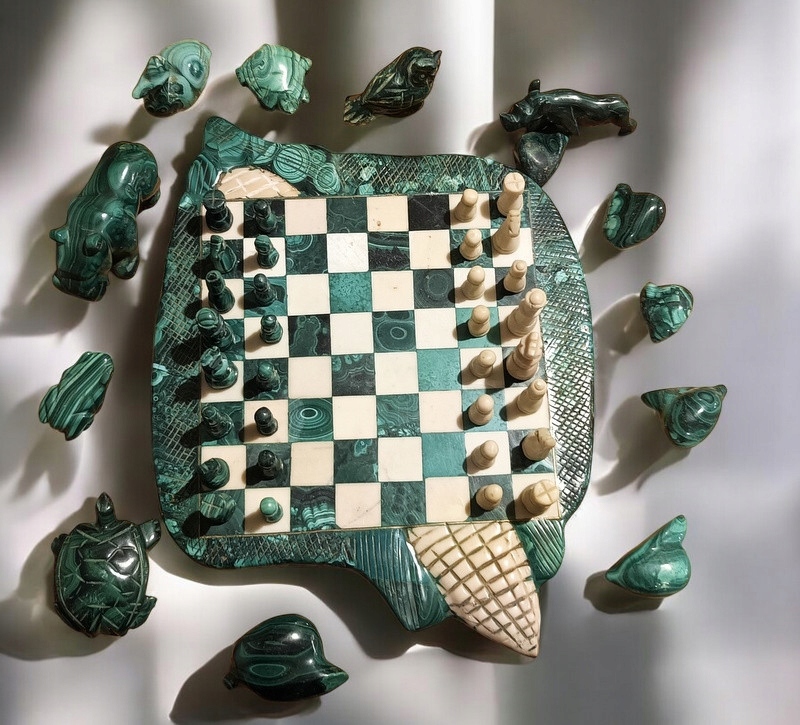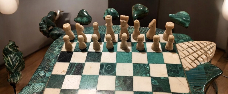 Шахматы импортированы из Франции. Они выглядят фантастически в зеленом и экрю цветах; особенно уникальные узоры на зеленой части мрамора. Дополнительно в набор входят животные и валуны, также выполненные из мрамора (у носорога отсутствует одна нога - последнее фото). В остальном состояние очень хорошее.