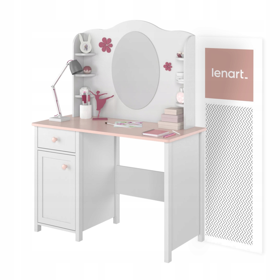Расширение – туалетный столик для объединения с письменным столом (LN-03) или комодом (LN-05). Идеально подойдет для комнаты каждой элегантной женщины, как небольшого размера, так и небольшого размера. больше. Оборудован большим овальным зеркалом и небольшими полочками для косметики, украшений и других аксессуаров. Мебель изготовлена из прочного ламината, отделанного прочной кромкой АБС.