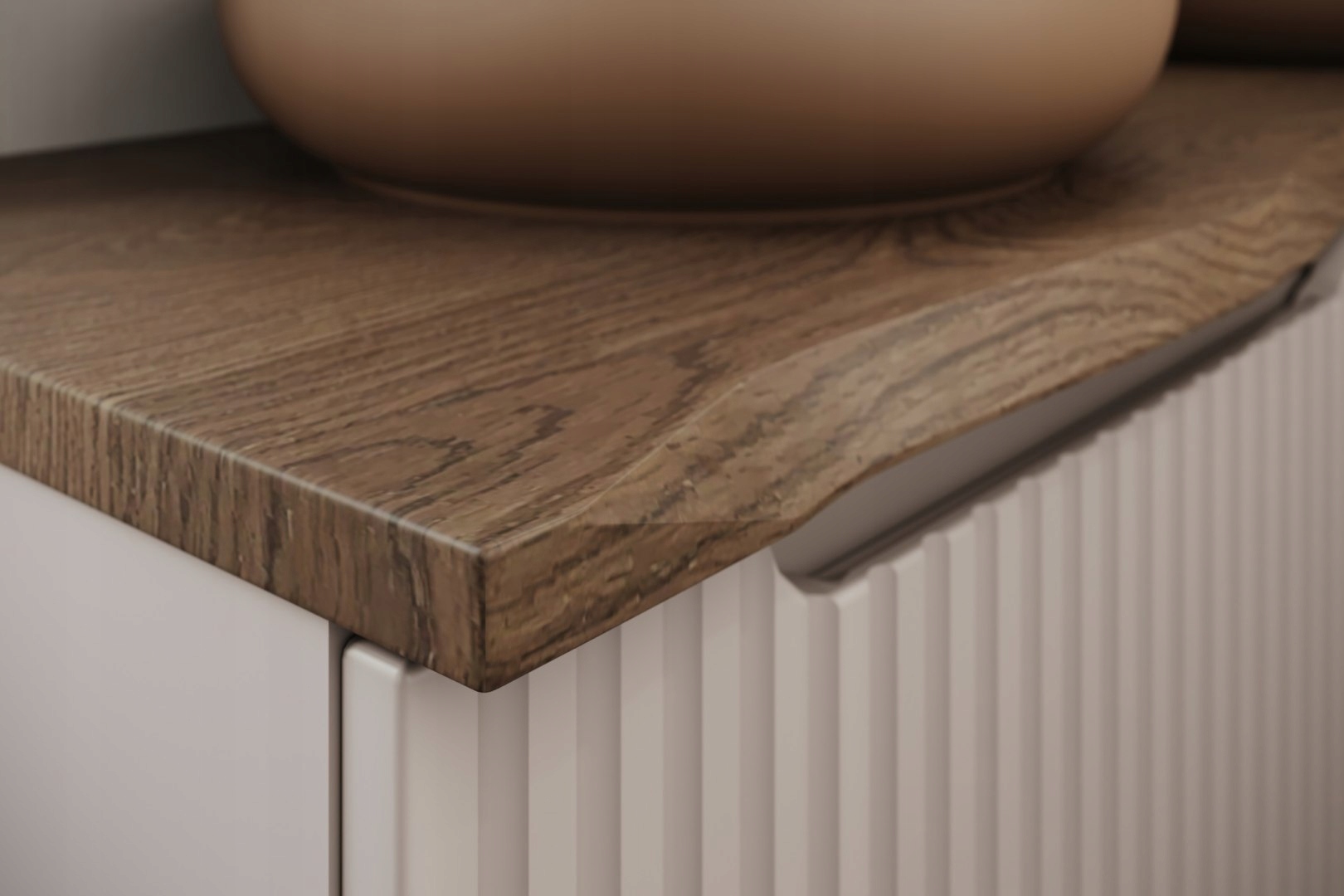 Столешница высотой 60 см из коллекции Nature — предложение, вдохновленное натуральным деревом: ее неровный, слегка волнистый край имитирует натуральный срез дерева, придавая интерьеру аутентичный и уютный вид. атмосфера. Отделка Дуб Казелла темного и приглушенного цвета дополняет грубый характер формы и привносит в интерьер нотку изысканной простоты. Столешница была разработана для шкафов под умывальник глубиной 40 см, с которыми она создает гармоничное и функциональное сочетание, а изготовленная из плиты МДФ и пленки ПВХ обеспечивает эстетичный внешний вид на долгие годы.