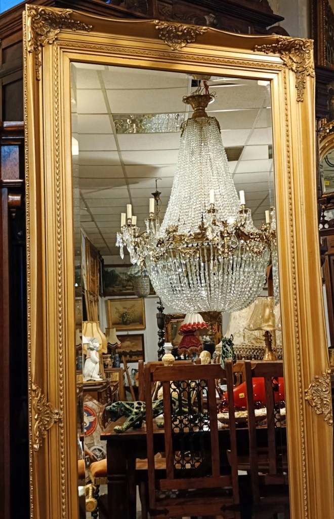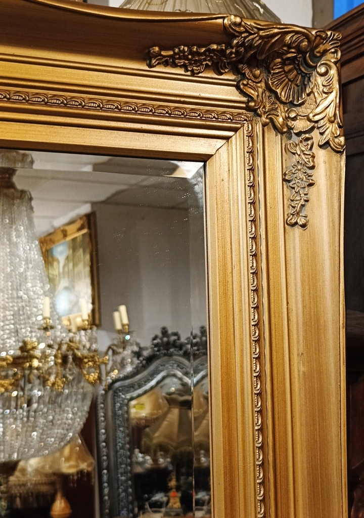 красивое и эффективное кристаллическое зеркало (канальное стекло) в прекрасной деревянной раме цвета старого золота; украшен отличными декорами. Зеркало сделано сегодня, но это выглядит как старая историческая выставка. Они наслаждаются своей изощренностью и оригинальностью. Только украшение.
