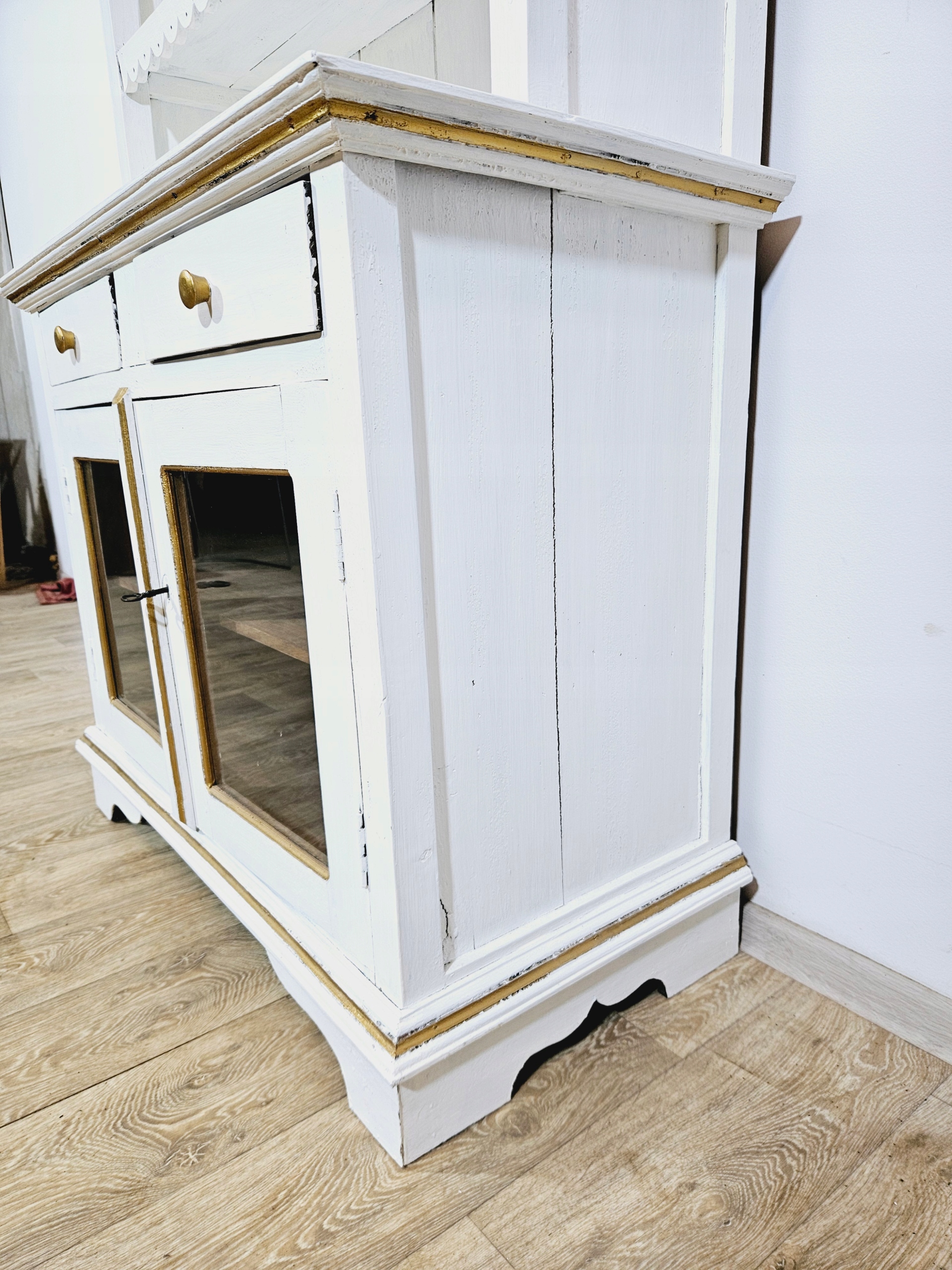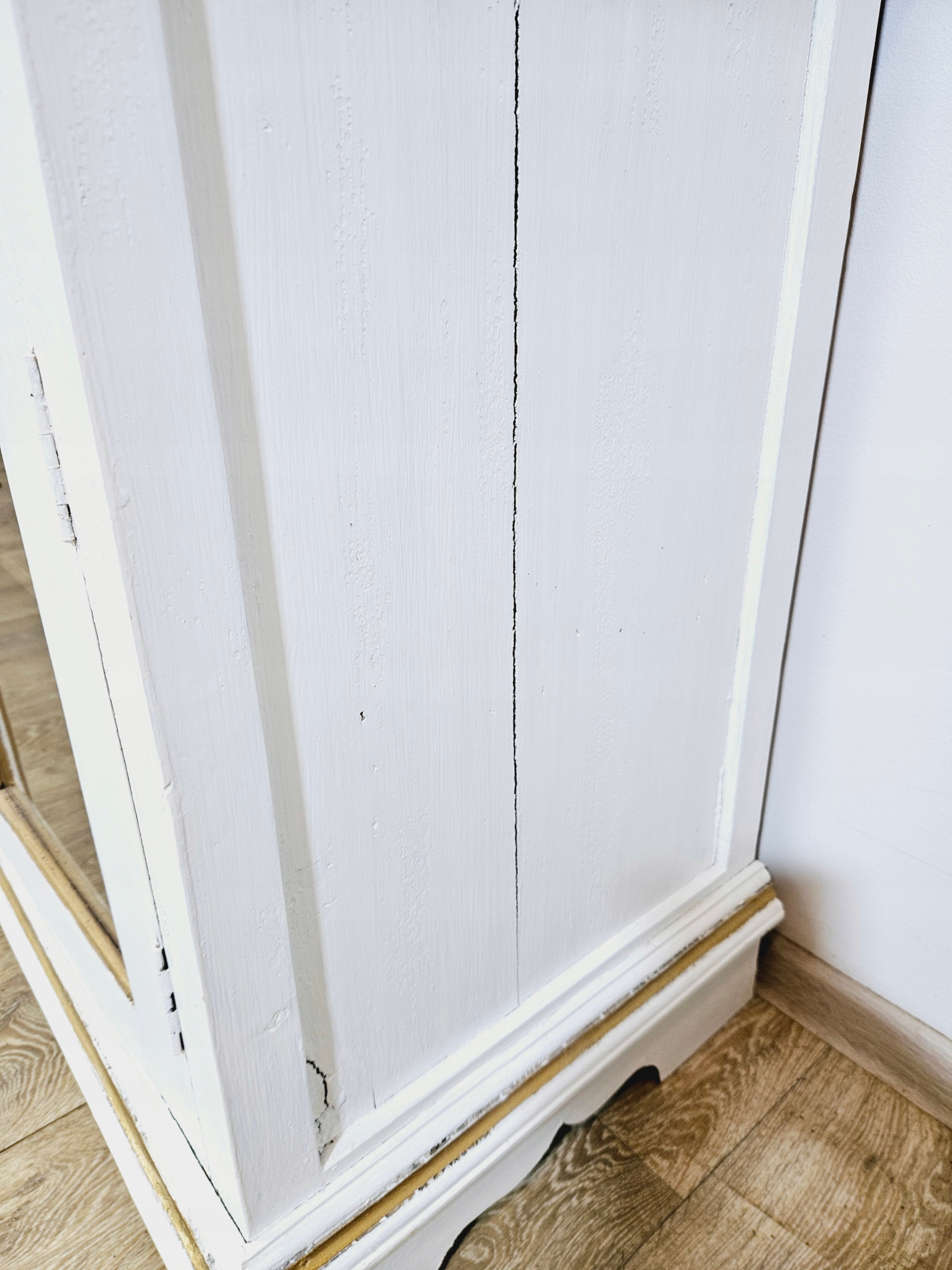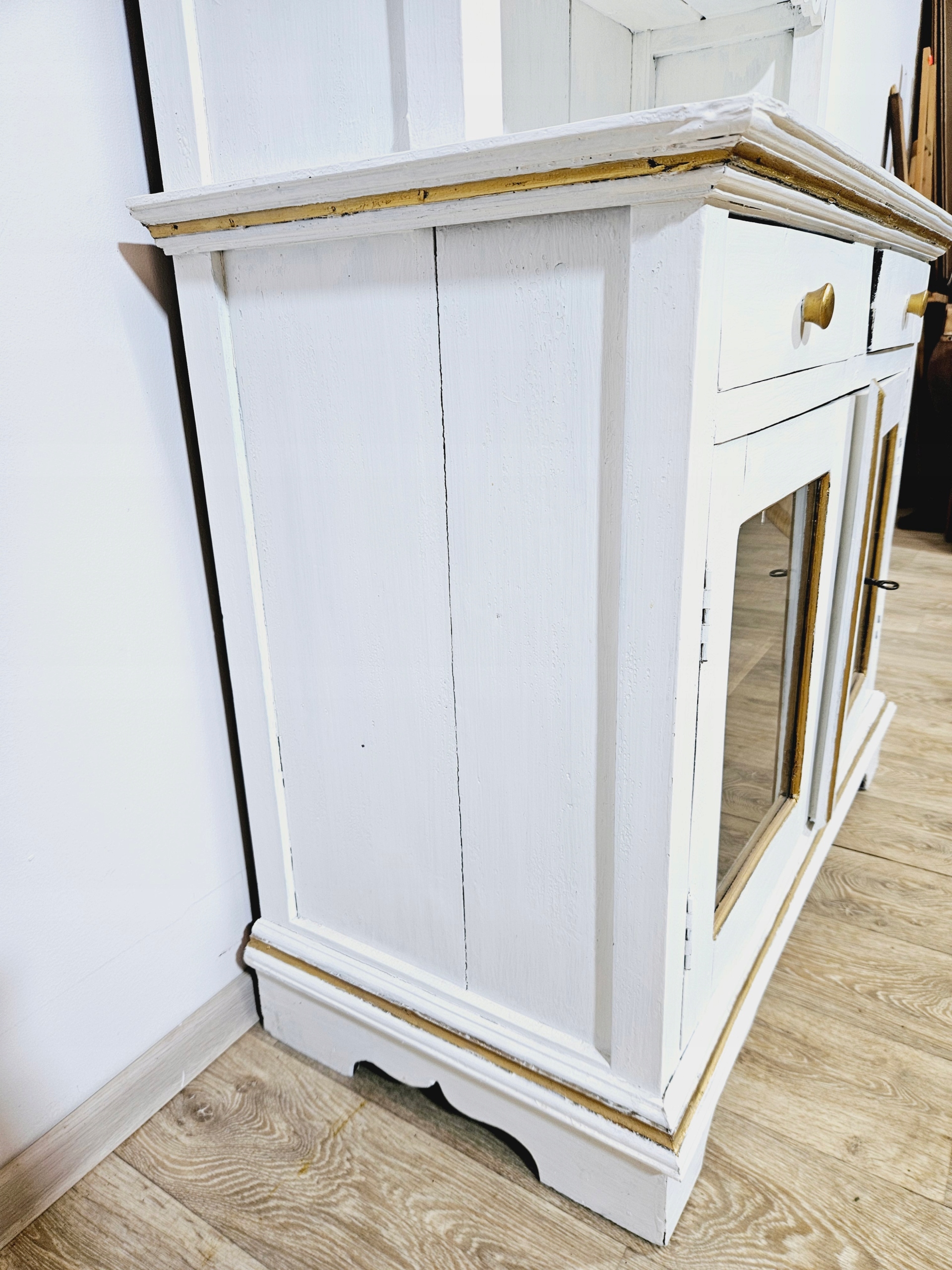 - отделка: освеженная, окрашенная в белый цвет с тонкими, золотыми ссадинами, которые придают ему стильный, старый вид в стиле потертого шика. Золото, круглые ручки ящика добавляют всю элегантность.