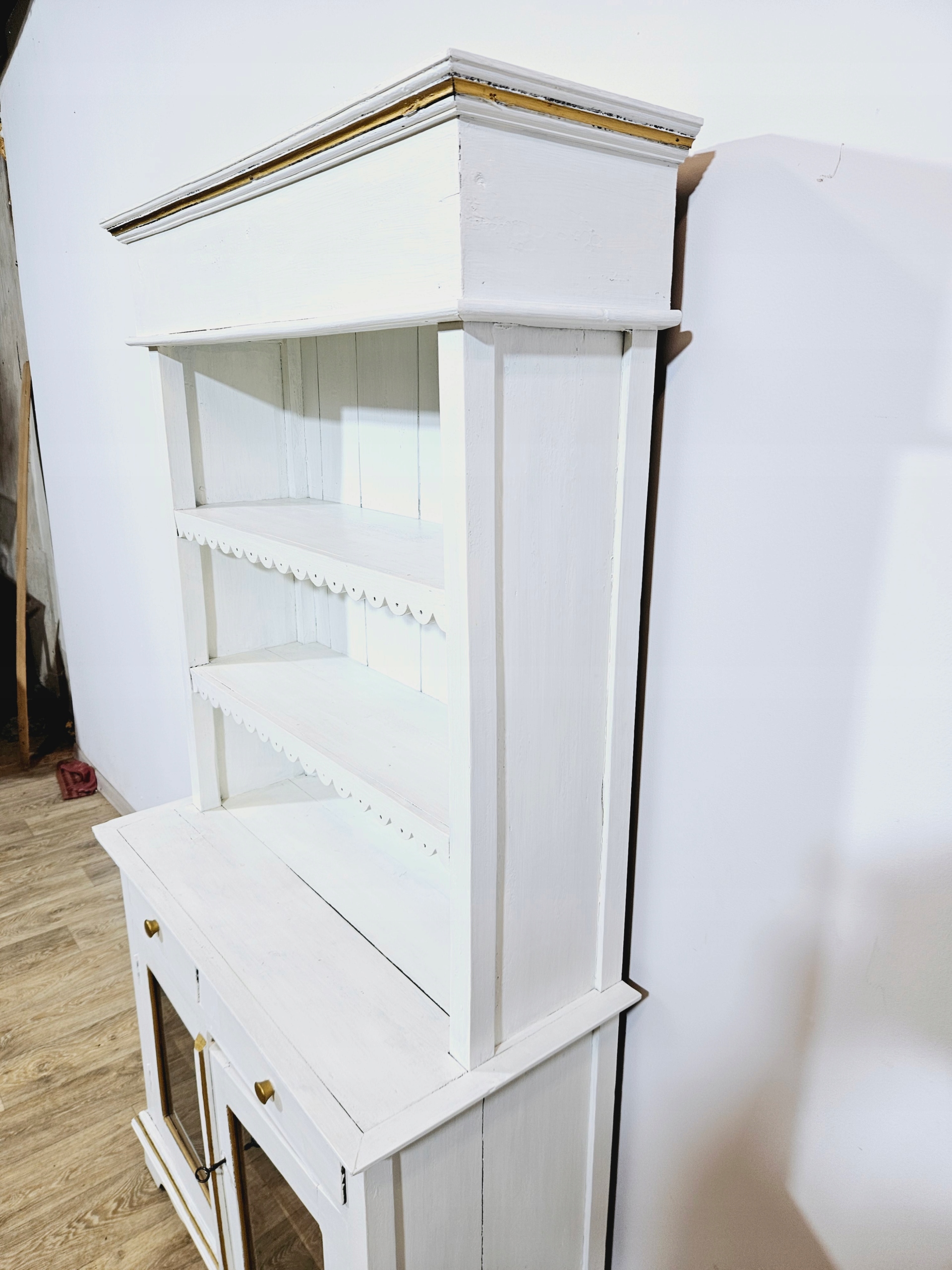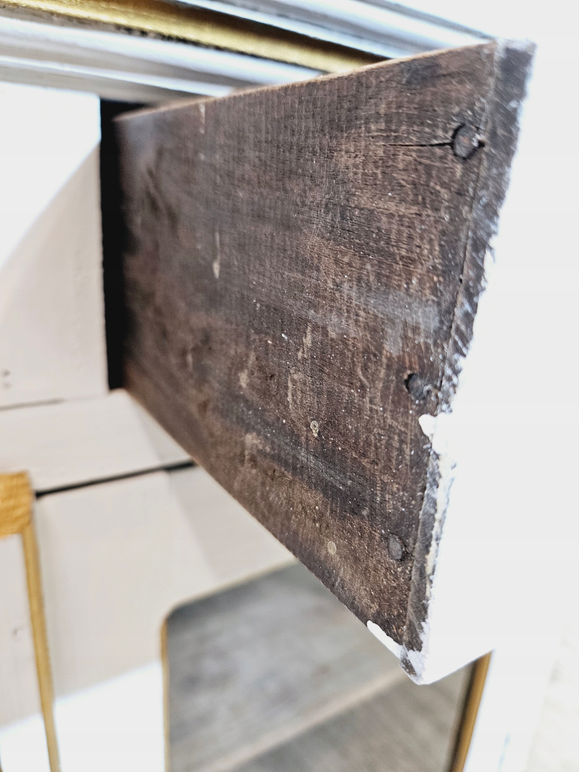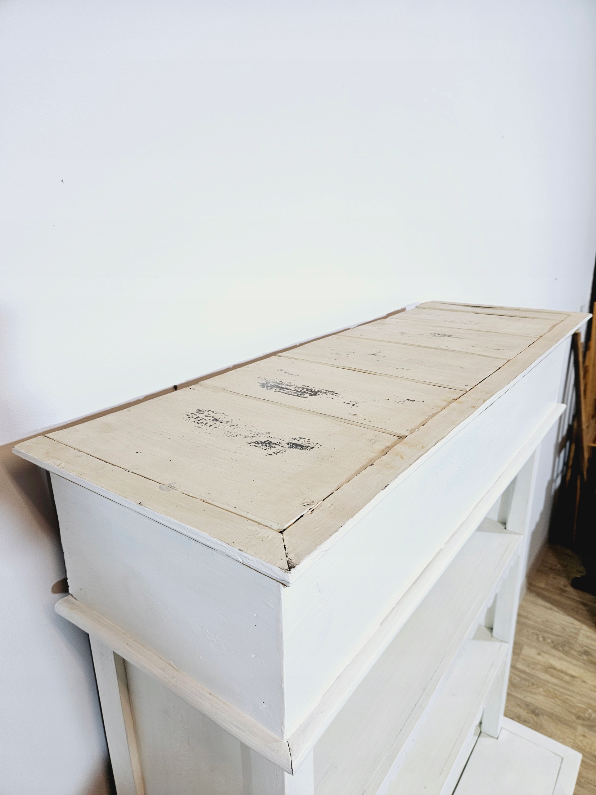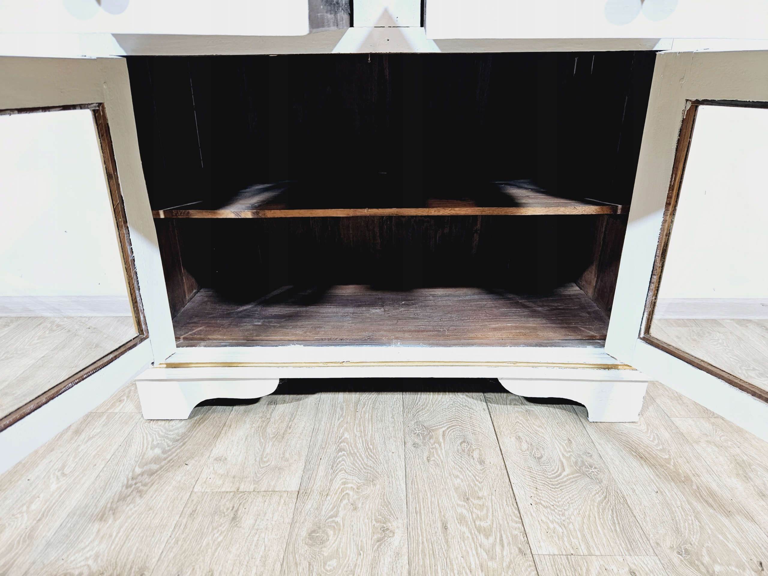 - отделка: освеженная, окрашенная в белый цвет с тонкими, золотыми ссадинами, которые придают ему стильный, старый вид в стиле потертого шика. Золото, круглые ручки ящика добавляют всю элегантность.