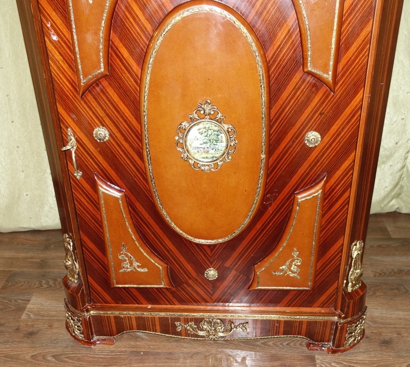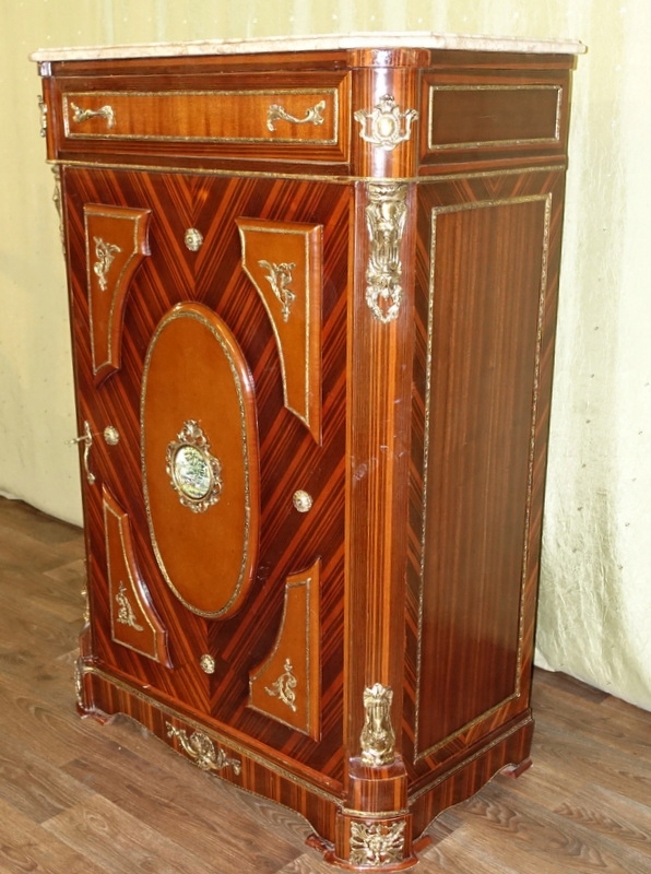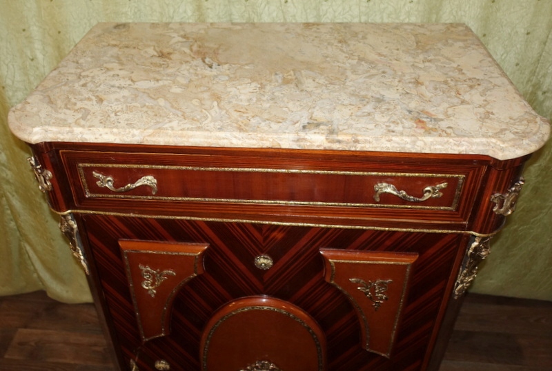 Мебель полностью из дерева. Имеет шкаф с дверцей, разделенный полками, и выдвижной ящик под столешницей. Цвет темного ореха, дополненный латунным декором и ручками, столешница комода выполнена из темно-бежевого мрамора с натуральными прожилками. Комод очень элегантный и изысканный. Это обязательно будет полезная вещь дома или станет украшением, например. в зале.