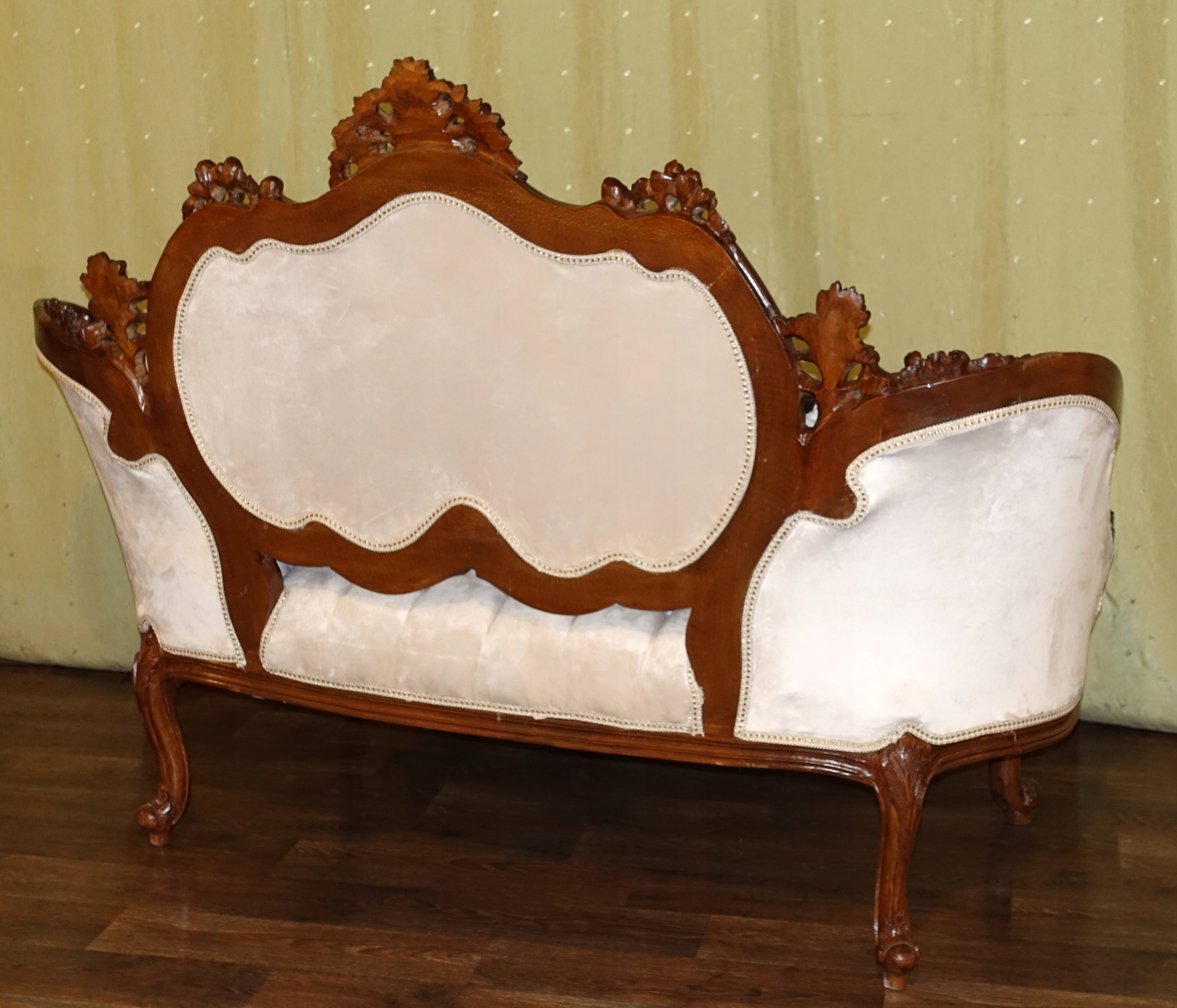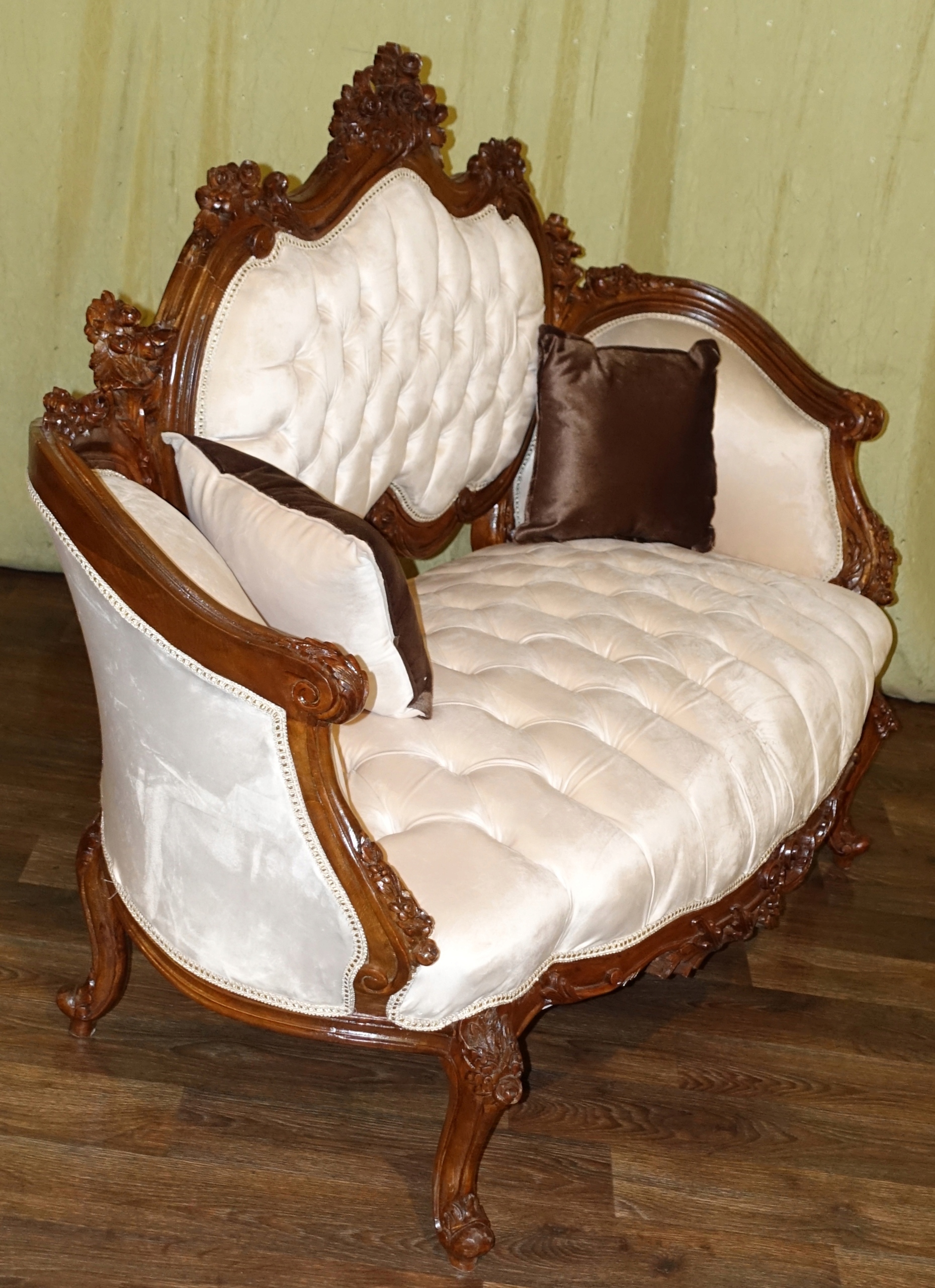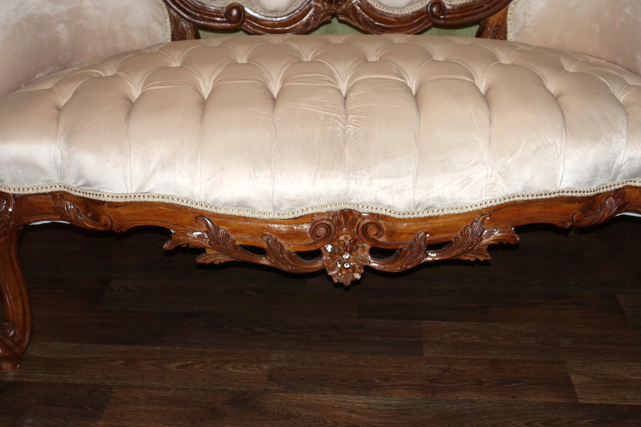 диван в дворцовом табурете h1> плюшевый материал в бежевом оттенке с прекрасным и со вкусом стегания. 100% деревянная структура в темном грецком со вкусом скульптуры - очень хорошее состояние. h1>