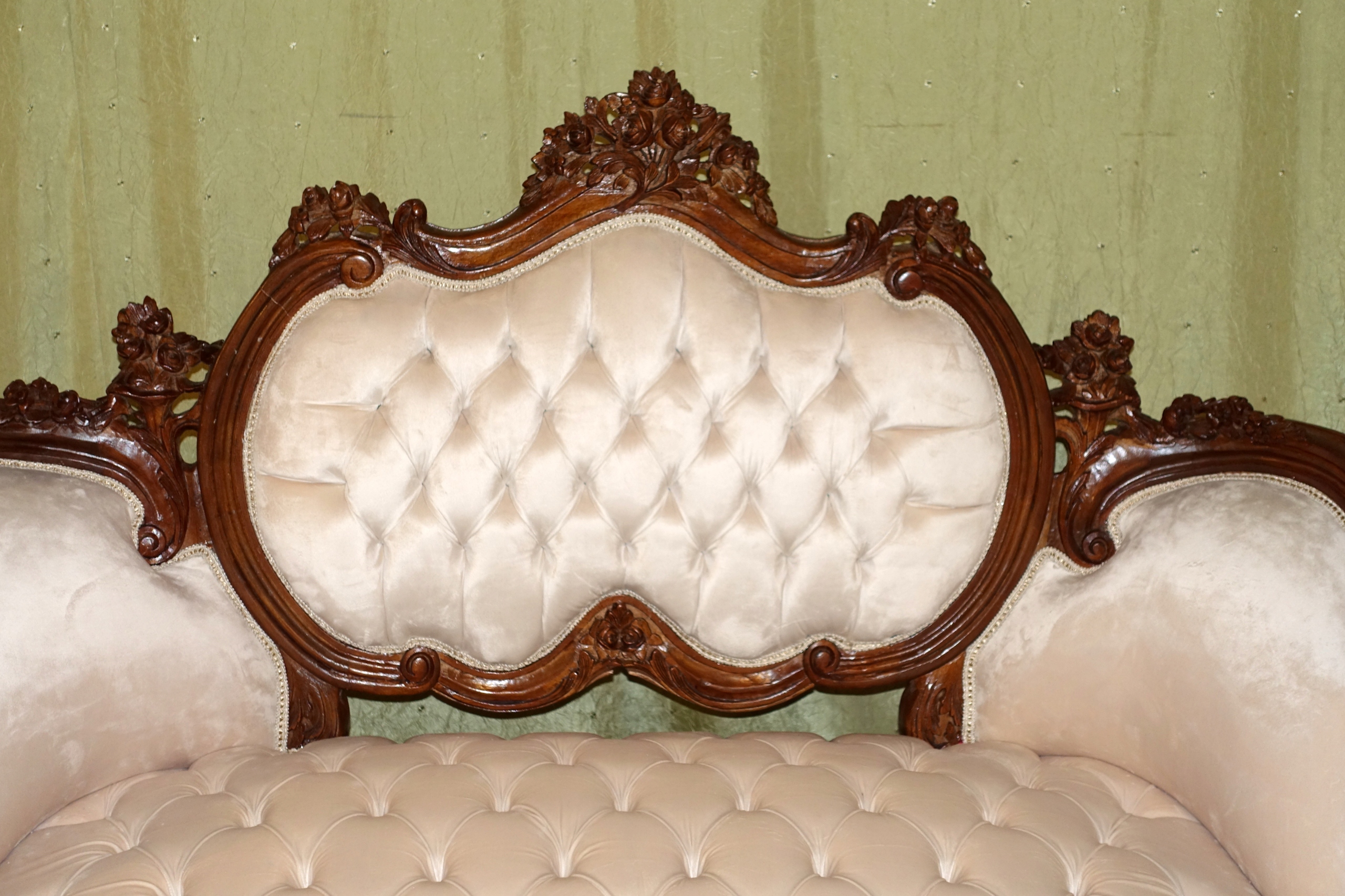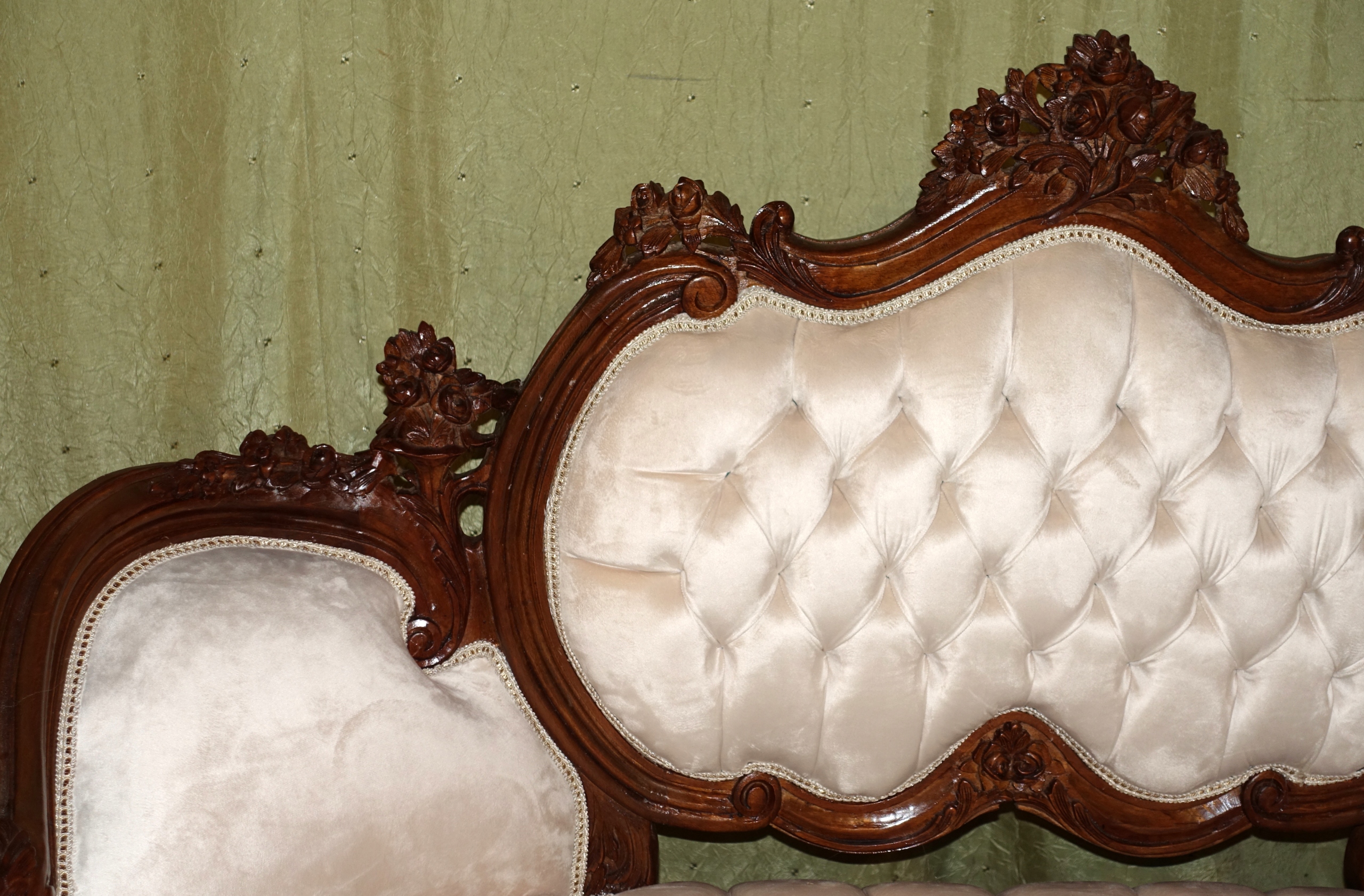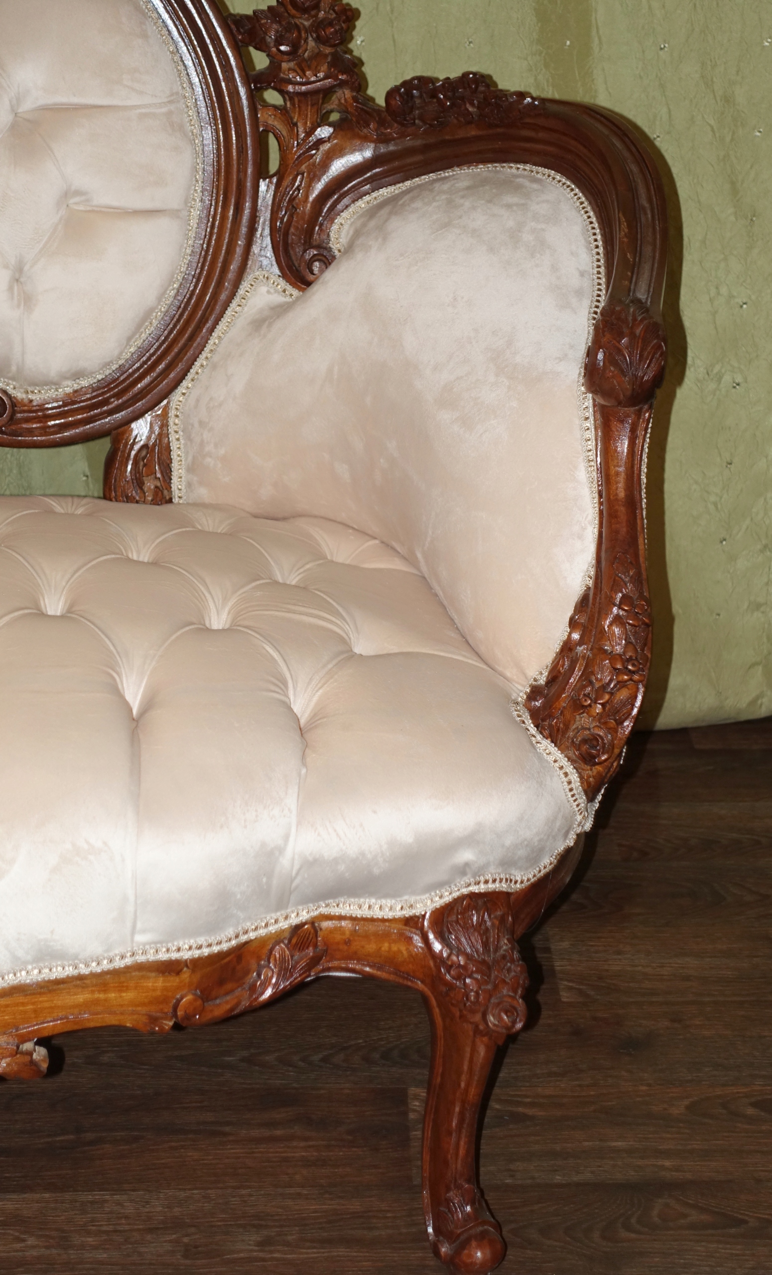 диван в дворцовом табурете h1> плюшевый материал в бежевом оттенке с прекрасным и со вкусом стегания. 100% деревянная структура в темном грецком со вкусом скульптуры - очень хорошее состояние. h1>