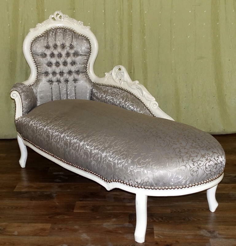 Современная копия дивана – шезлонг. Новый, неиспользованный. Обивка выполнена из мерцающего атласного материала пепельно-серебристого цвета с нежным растительным орнаментом. Деревянная конструкция античного белого цвета с изысканной резьбой. Материал соединялся с деревянной конструкцией с помощью декоративных никелированных штифтов. Очень рекомендую как удобный предмет мебели и украшение гостиной