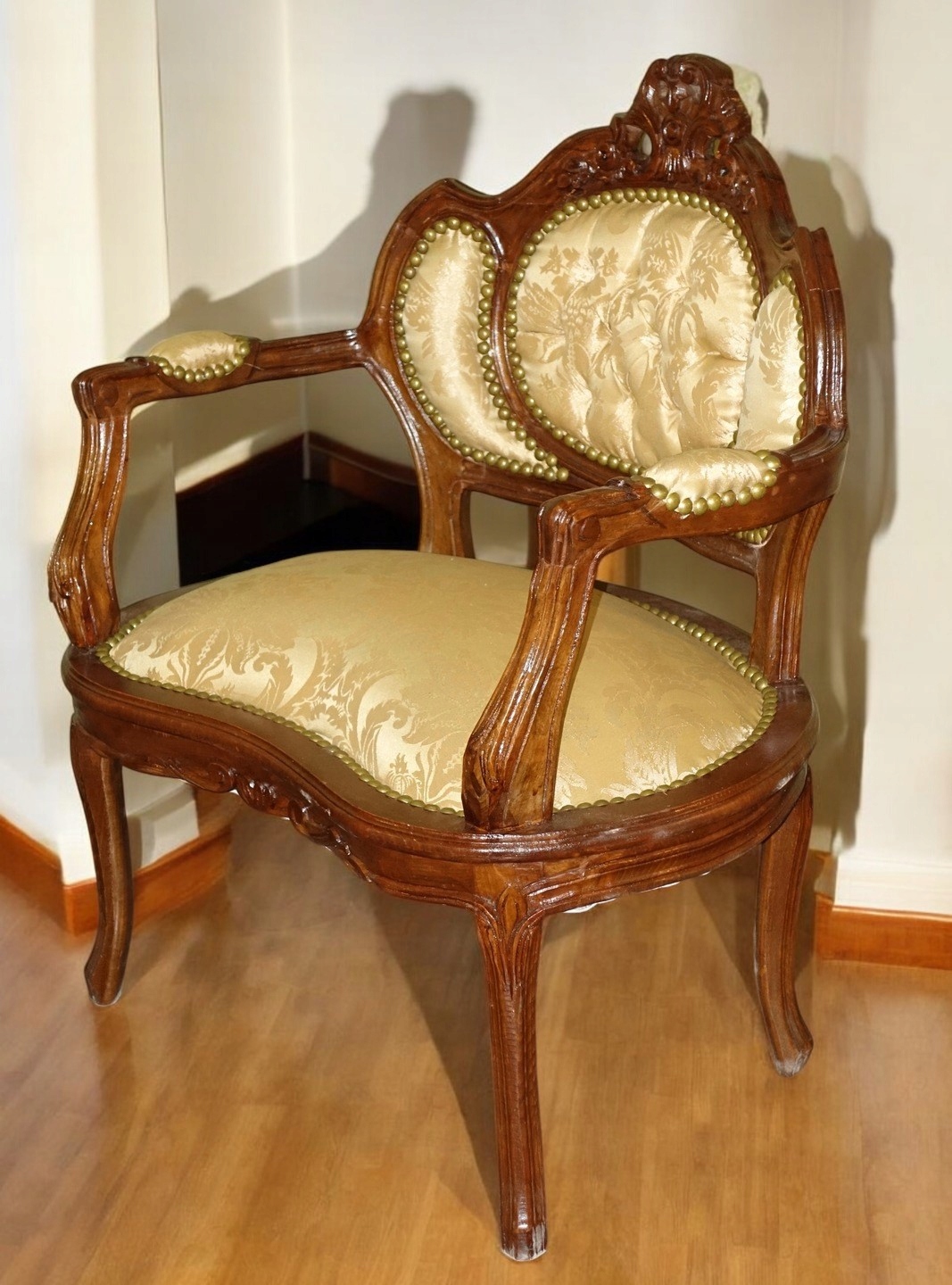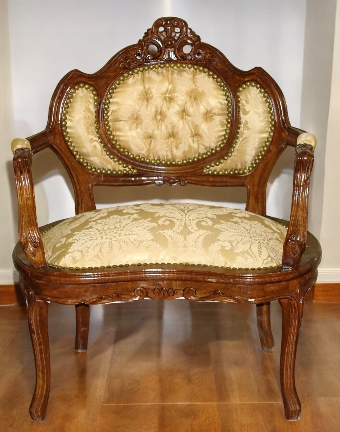 В комплект входят: диван, два кресла и журнальный столик со столешницей из мрамора песочного цвета. Древесина темного ореха. Обивка выполнена из материала золотого цвета с характерным растительным узором. Обивка эффектно отделана декоративной латунной булавкой - очень хорошее состояние.