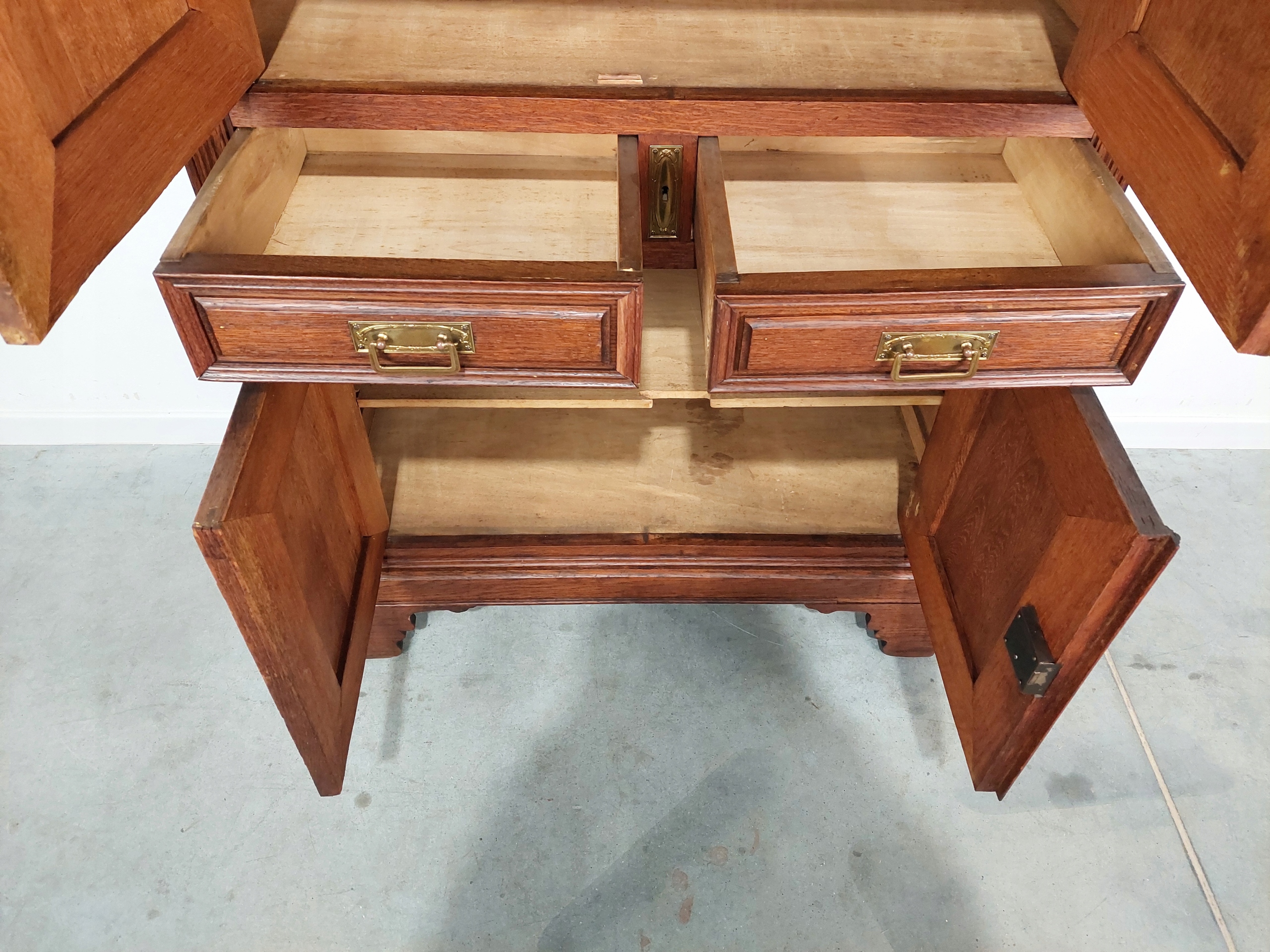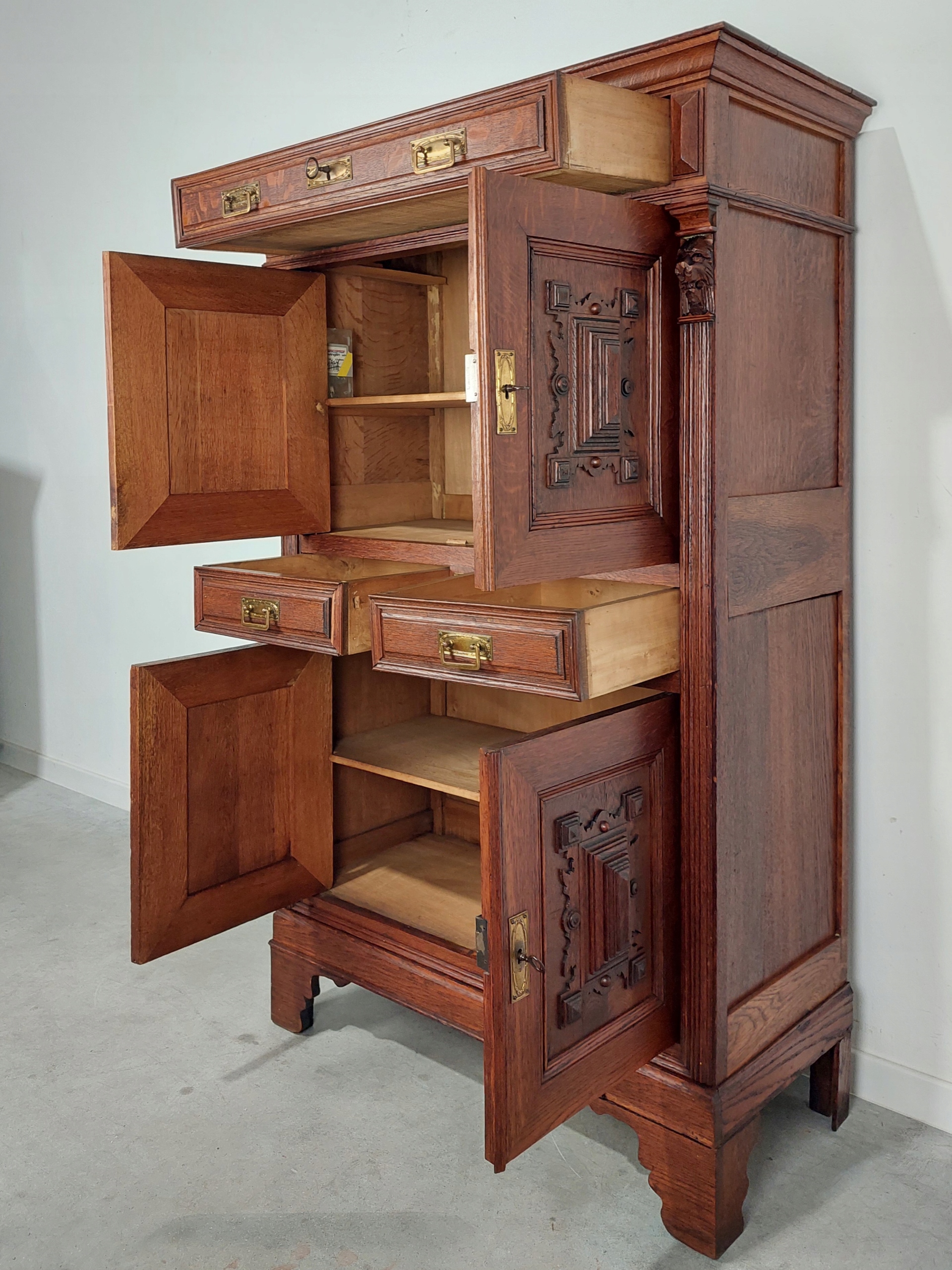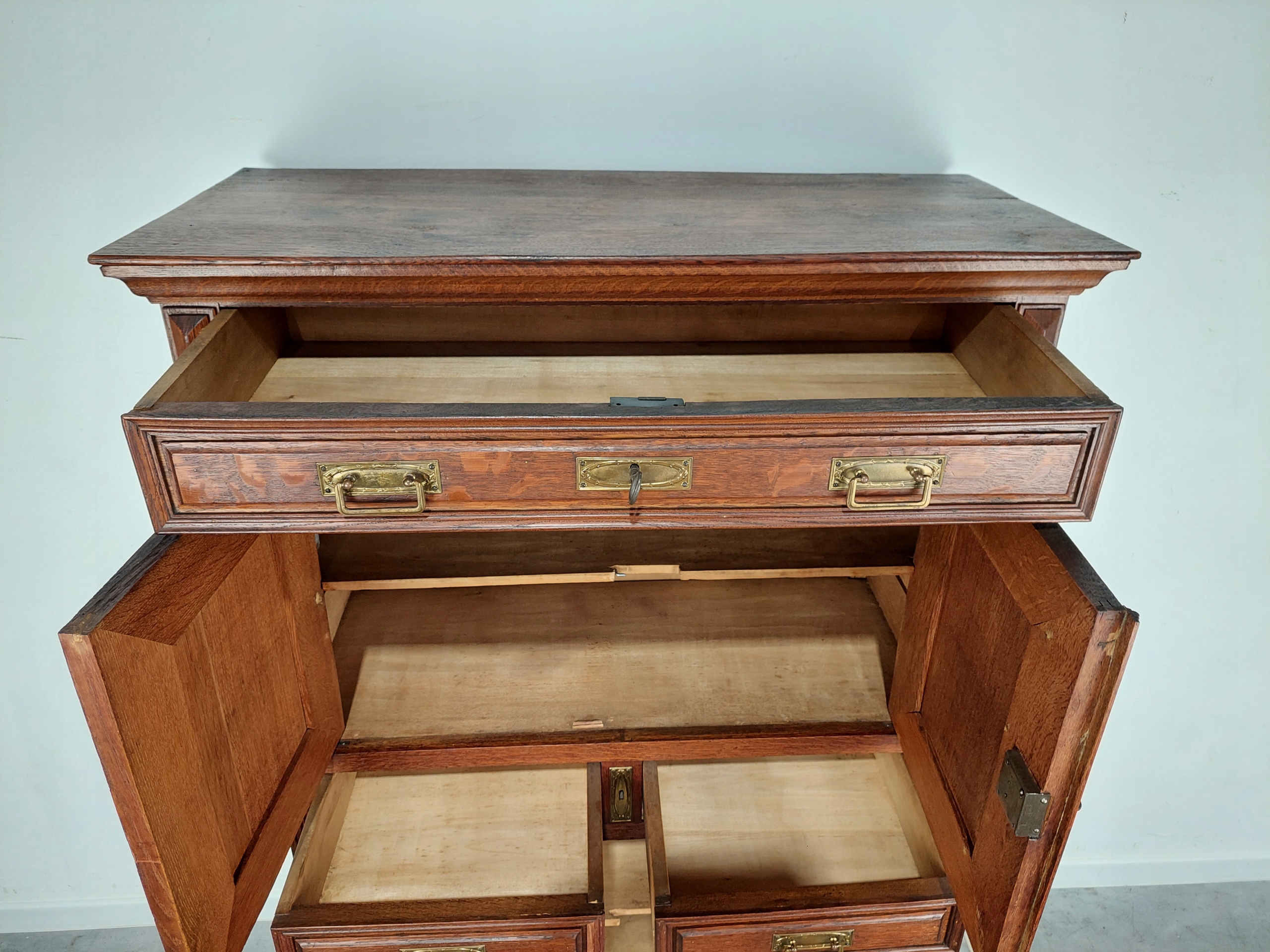 Стильное эклектичное нижнее белье с дубовым комодом. Уникальная, редкая и в то же время искала модель. Красивое рубежное каркас. Расчетная дата производства - 1920/1930. Мебель, полностью изготовленная из твердого дуба. Эффективные замки, ключи в наборе. Мебель показывает признаки использования, и из -за возраста могут показать следы ремонта. Нет фрагмента нижнего декоративного планка, задние ножки короче на 1 см, чем передняя. Детали показаны на изображениях ниже. Верх: 47 см