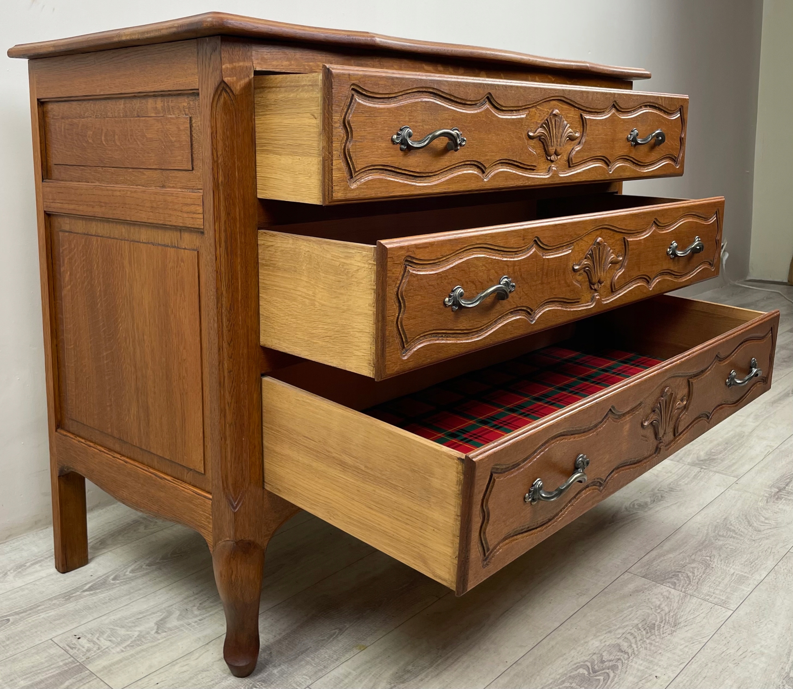 Красивая резьба и латунные ручки.