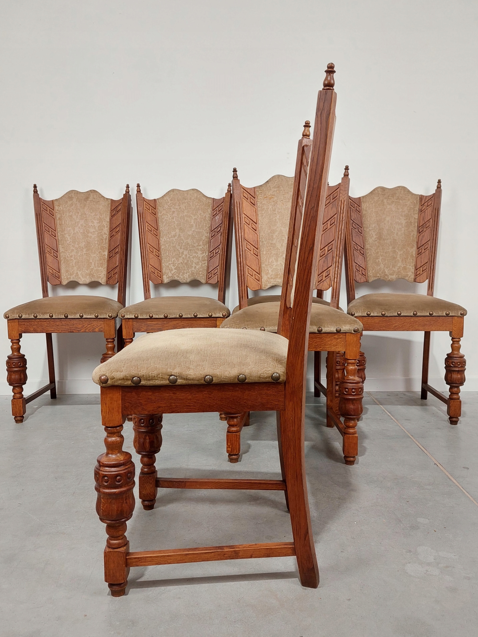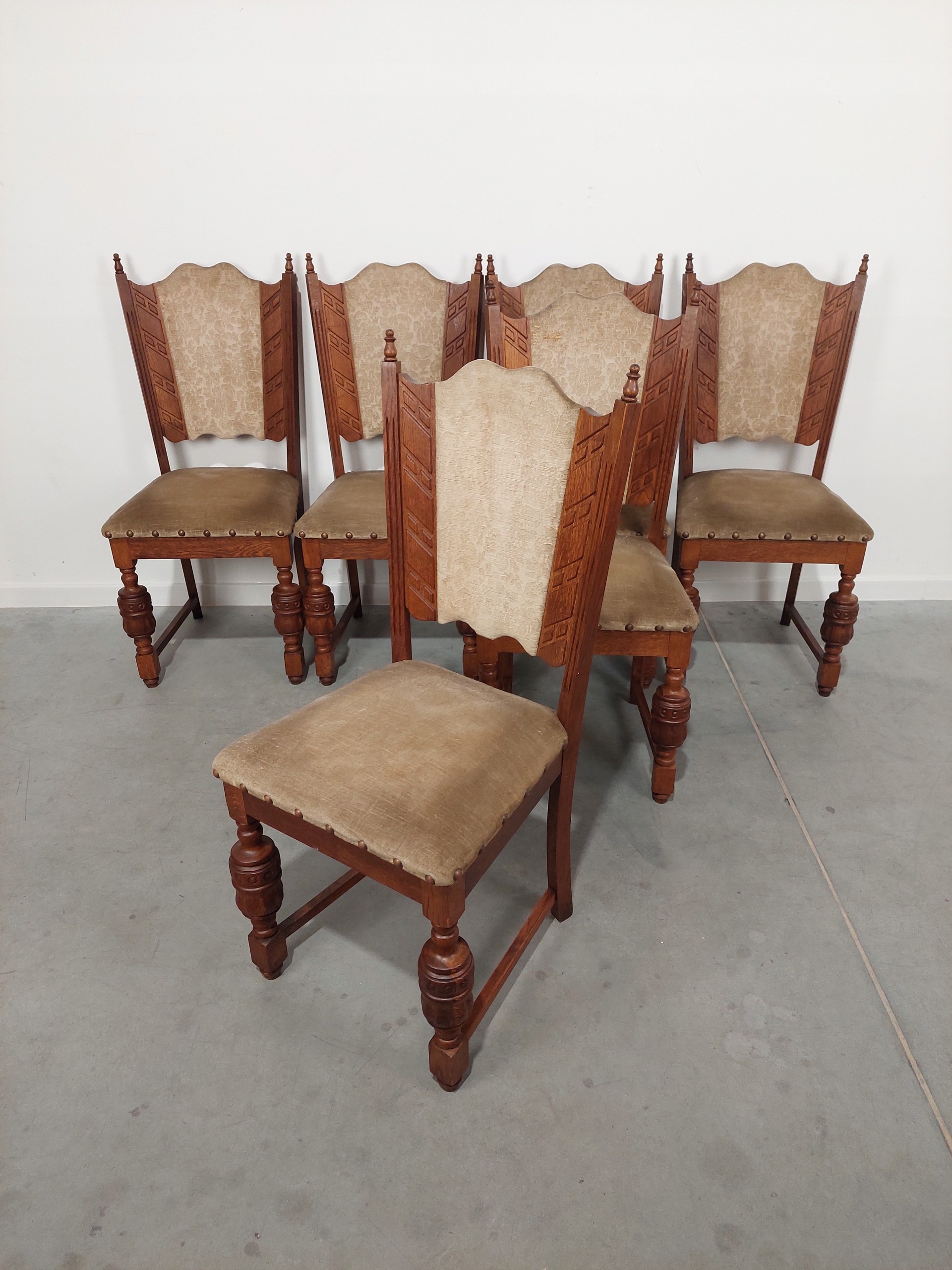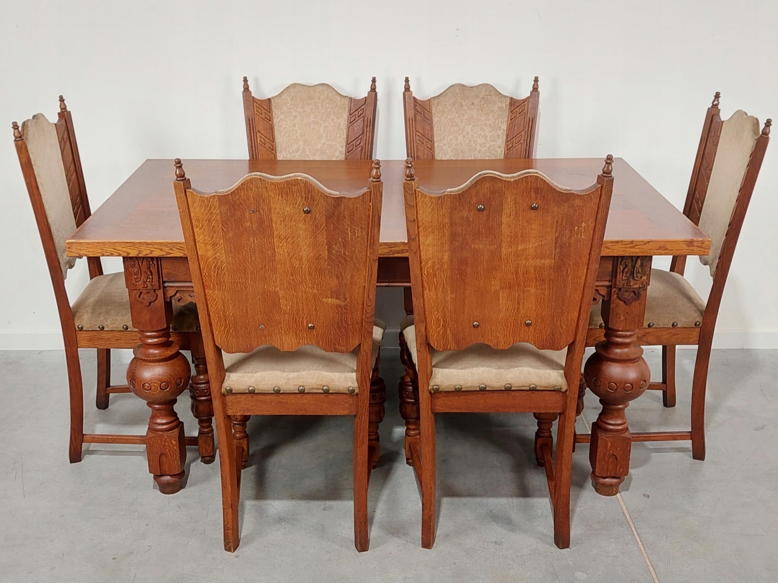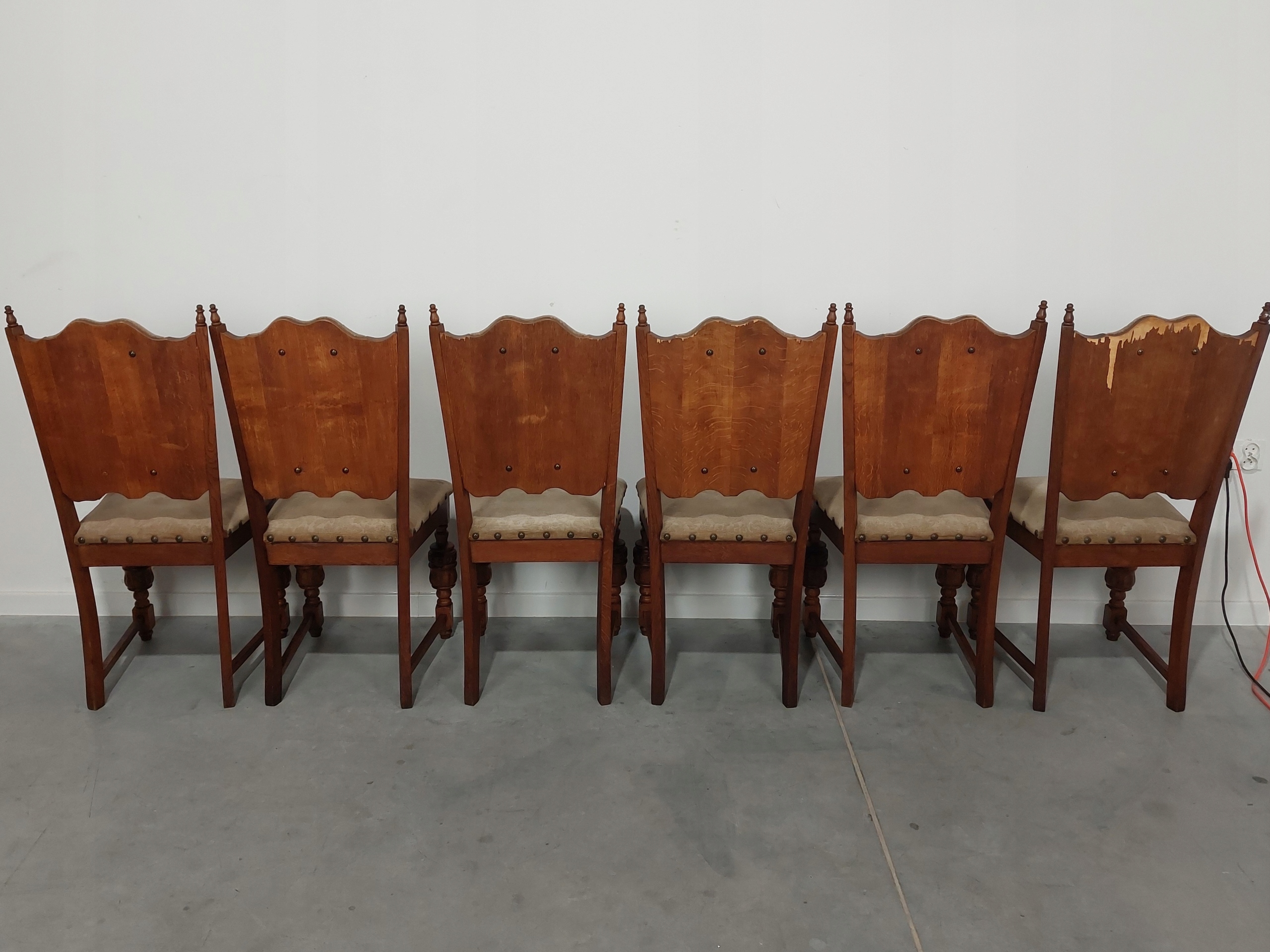 Стильный дубовый рыцарский стол с шестью мягкими стульями. Стол из дуба. Типичные потертости, царапины, потертости и т. д. на верхней части и ножках. Стол очень прочный, массивный и устойчивый. Конструкция мебели не требует склейки, обивка и спинки стульев требуют ремонта. Подробности на фотографиях ниже. Цена указана за стол в комплекте с 6 стульями.