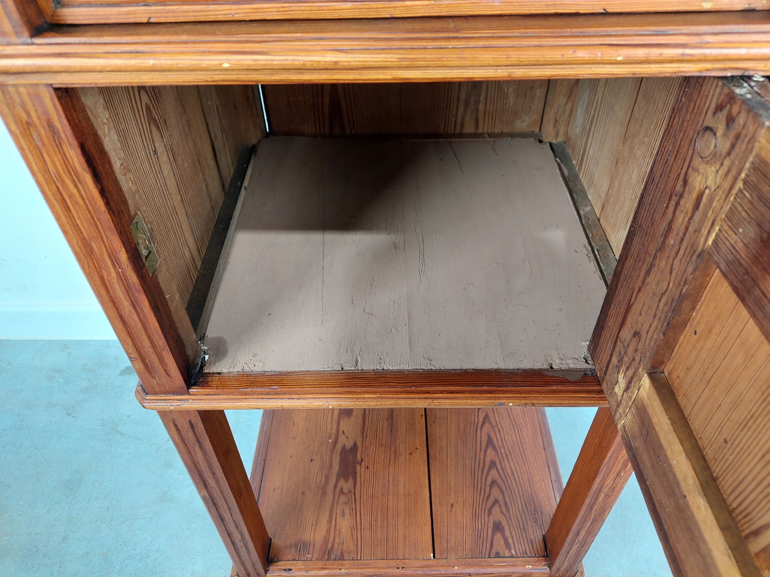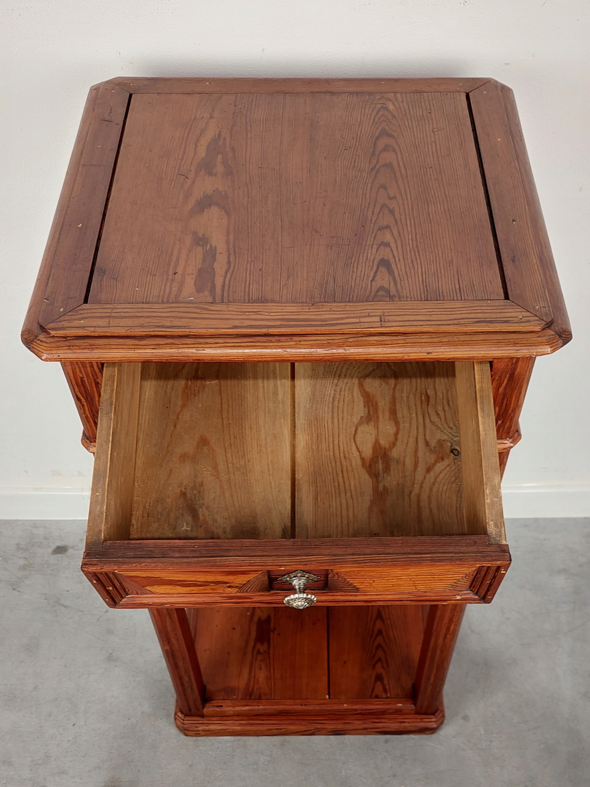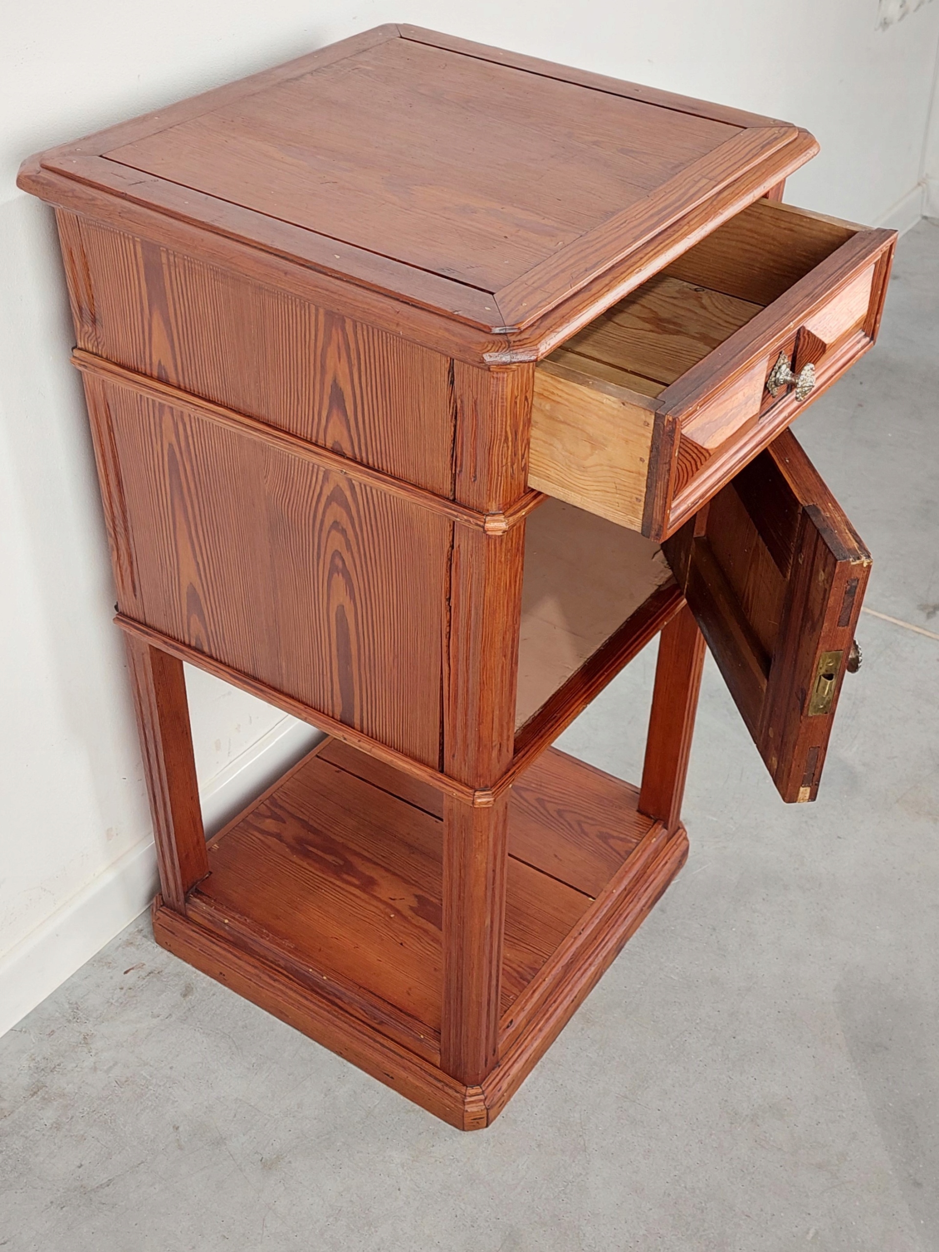 Стильная эклектичная прикроватная таблица, изготовленная из красной ели дерева. Мебель из -за возраста может показать следы ремонта и использования (оценивается от 80 до 100 лет). Видимые естественные причины и недостатки отдельных декоративных планок, потери у двери. Подробности, показанные на изображениях ниже.