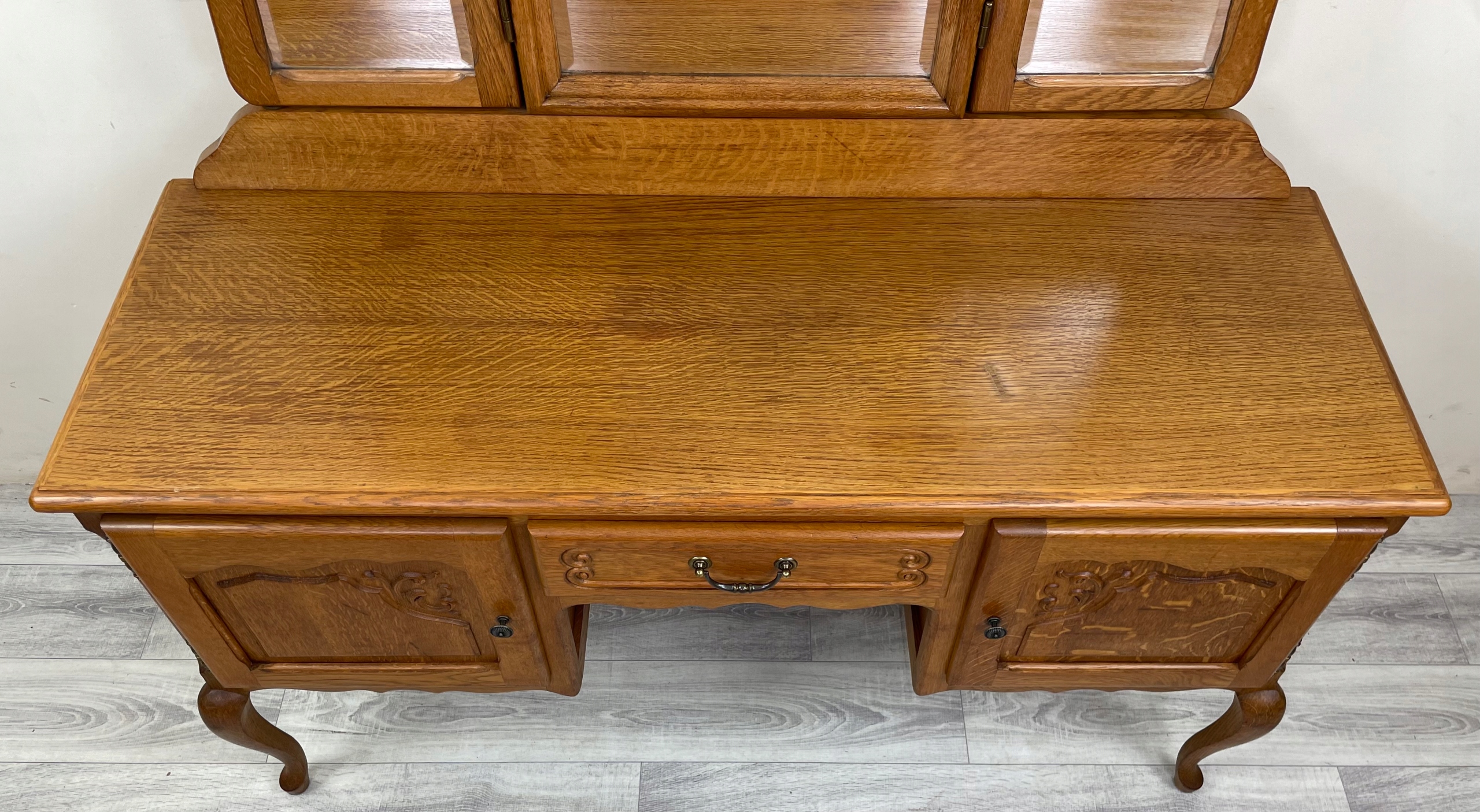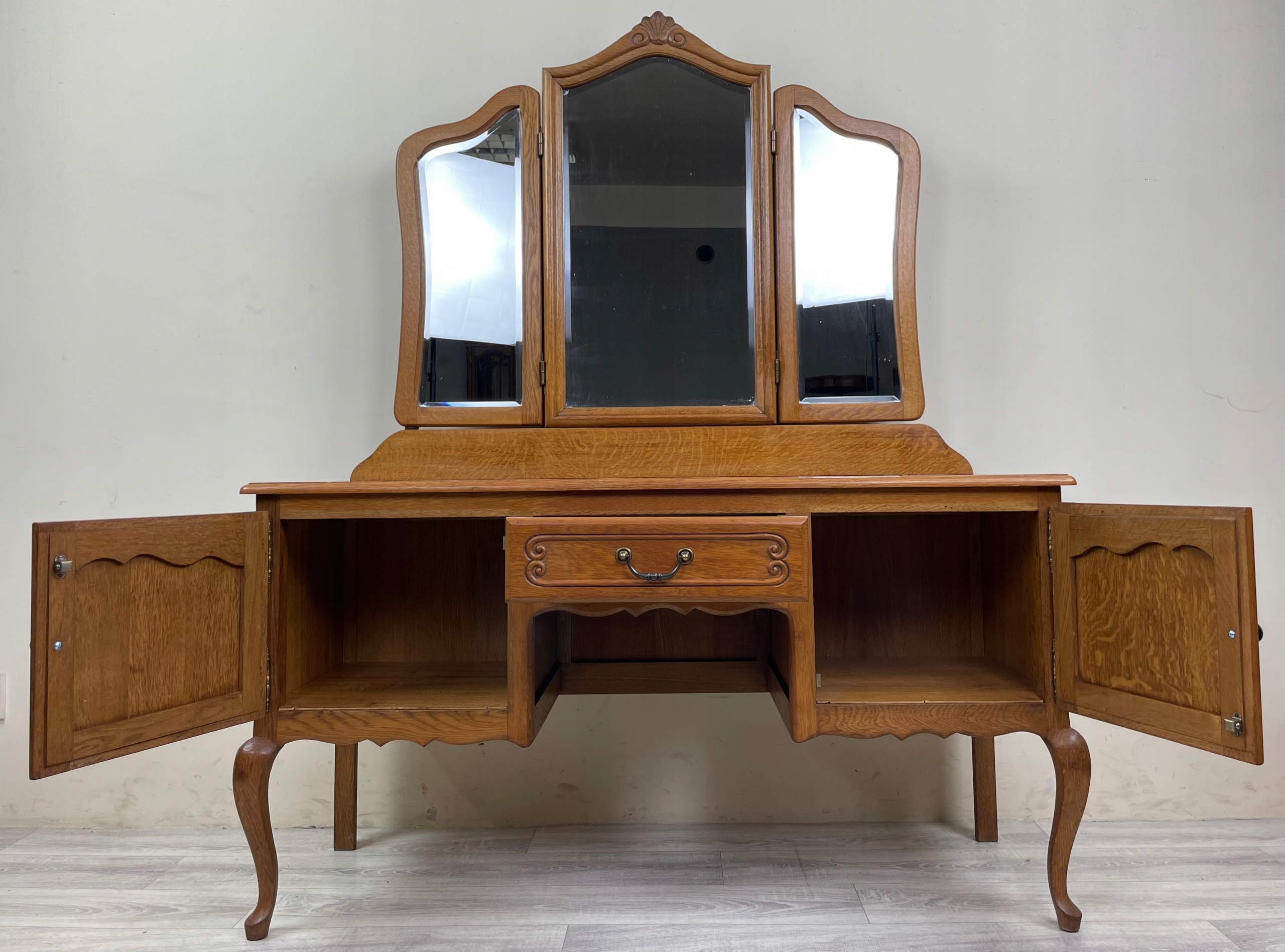 Верхняя часть туалетного столика представляет собой тройное хрустальное зеркало. Зеркало скошено и пришло из той эпохи. Две подвижные створки.