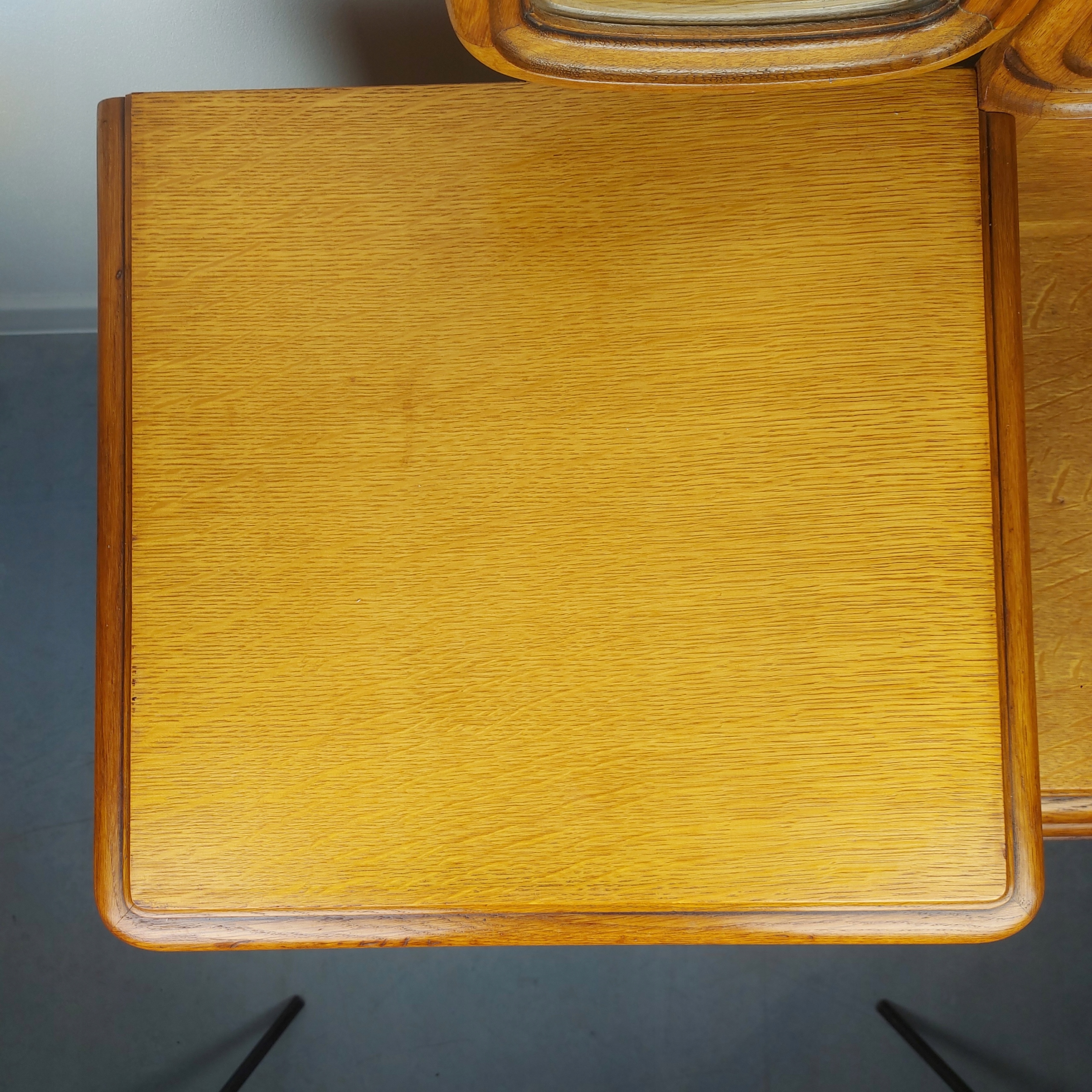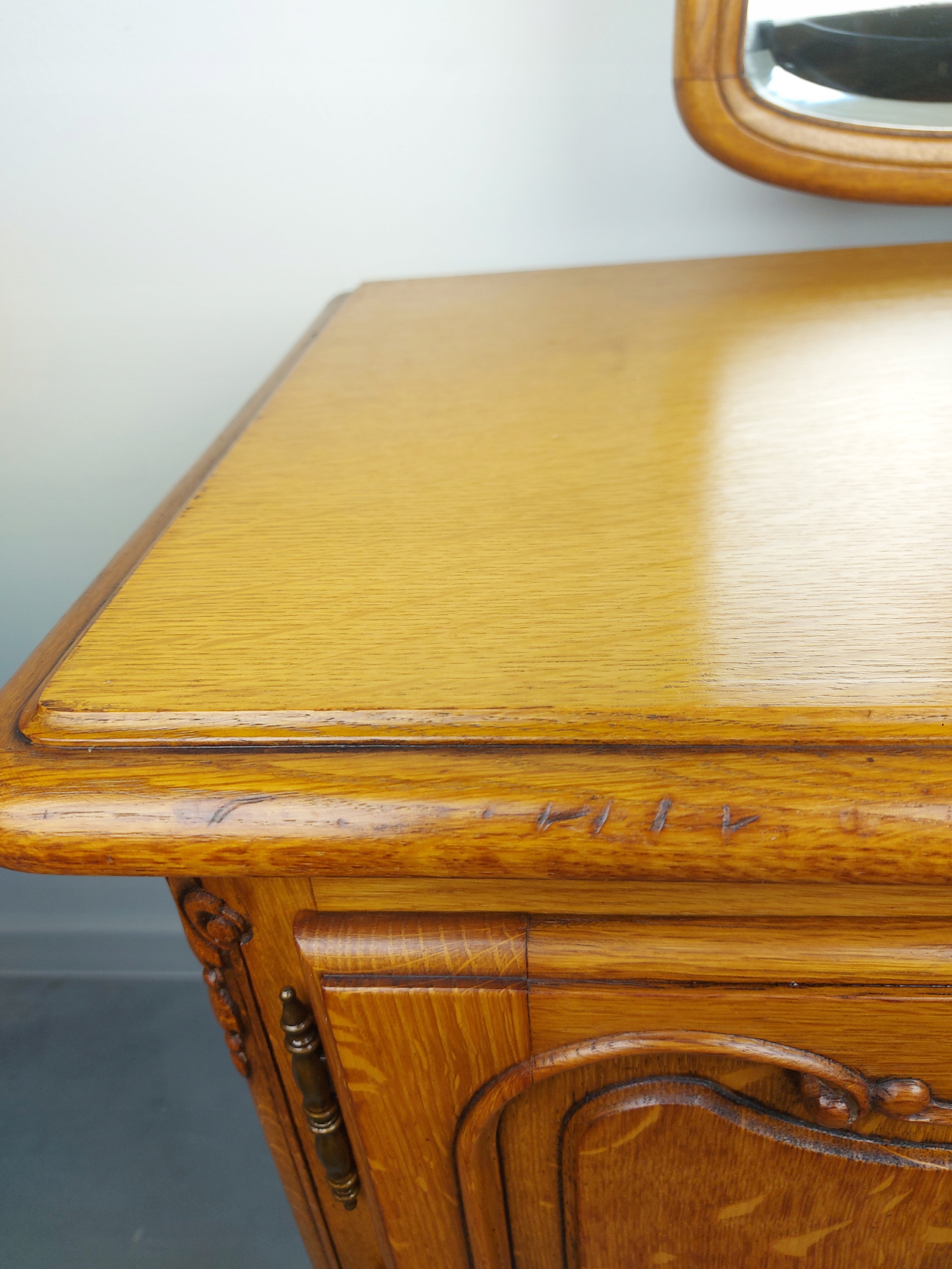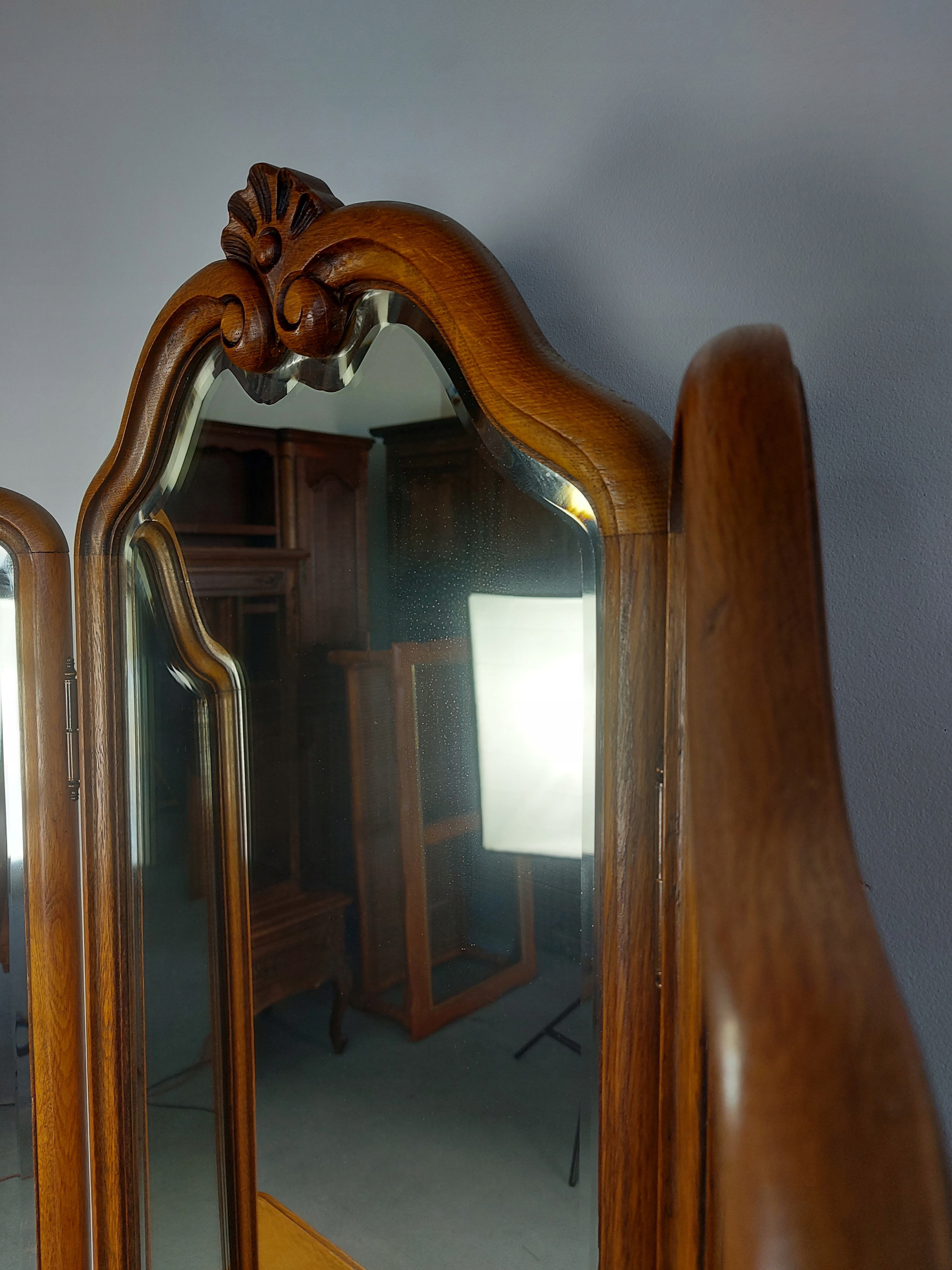 Стильный дубовый туалетный столик Ludwik. Старинное зеркало с регулируемыми боковыми крыльями, хрусталь в хорошем состоянии. Мебель имеет следы использования, например, единичные царапины. Детали описаны и показаны на фотографиях ниже.