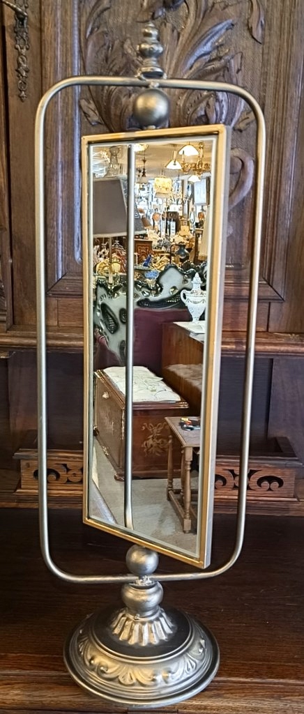 Красивое, эффектное вращающееся зеркало в раме на ножке. Новый, неиспользованный предмет, выполненный в современном, старинном стиле, из металла оттенка патинированной латуни. Восхищает своей изысканностью и оригинальностью.