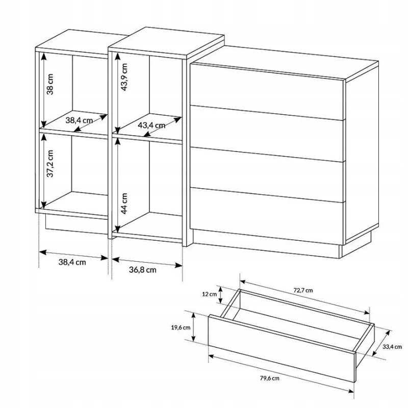 <р> — просторные ящики <р> – cokoł z wbijanymi nożkami <р> – края покрыты шпоном ABS <р> - комоды универсальные - возможность изменения направления открывания дверей <р> — качественный мебельный щит толщиной 16 мм <р> – нажмите, чтобы открыть систему открывания <р> - петли и направляющие с бесшумным закрываниемСостав набора: