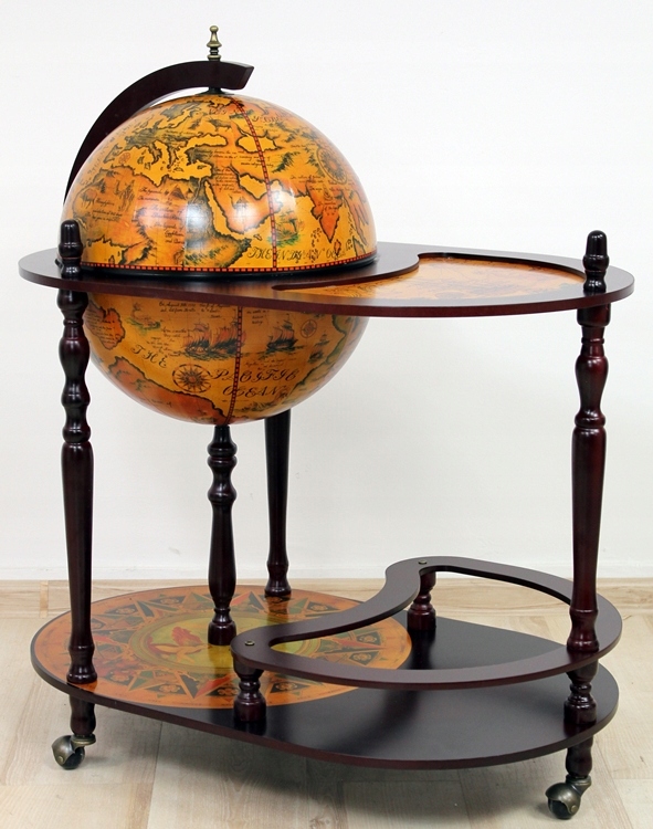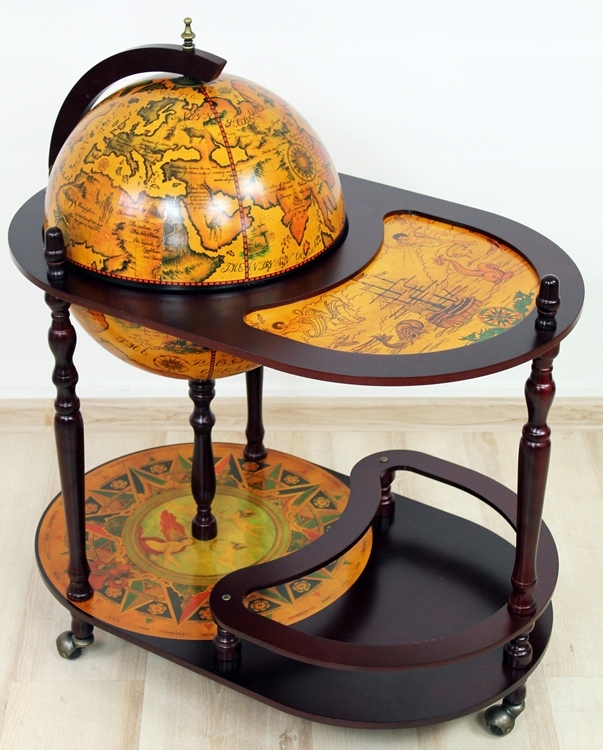 Стильная вещь, которая станет отличным подарком. Это очень практично и функционально. Внутри открывающегося шара есть место для бутылок и стаканов. Нижняя полка имеет профилированный фиксатор для бутылок. На поверхности сферы находится карта древнего мира. Штанга имеет поворотные колеса на шарикоподшипниках.