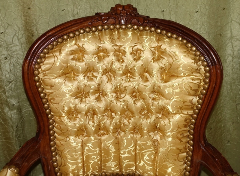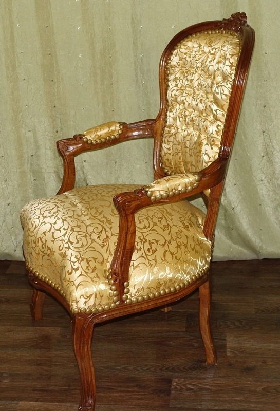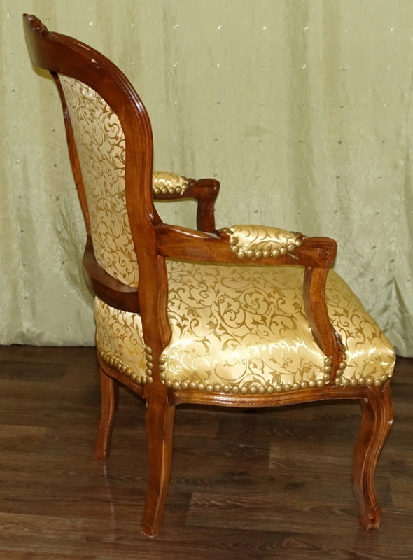 Кресло старинного образца, новое, неиспользованное. Древесина темного ореха. Обивка выполнена из материала золотистого цвета с нежным растительным узором. Соединение конструкции с обивкой завершено декоративной застежкой.