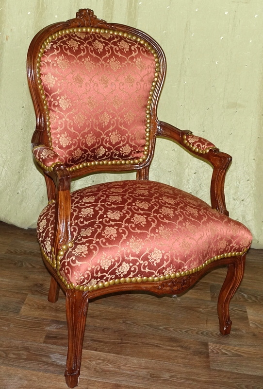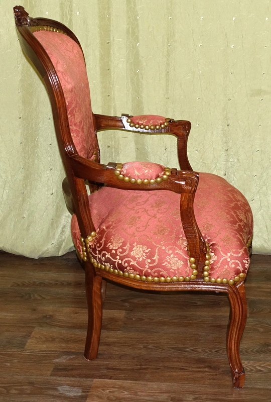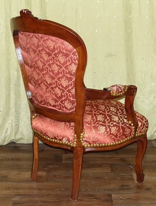 Кресло старинного образца, новое, неиспользованное. Древесина темного ореха. Обивка выполнена из материала кирпичного цвета с нежным золотистым цветочным узором. Соединение конструкции с обивкой завершено декоративной застежкой.