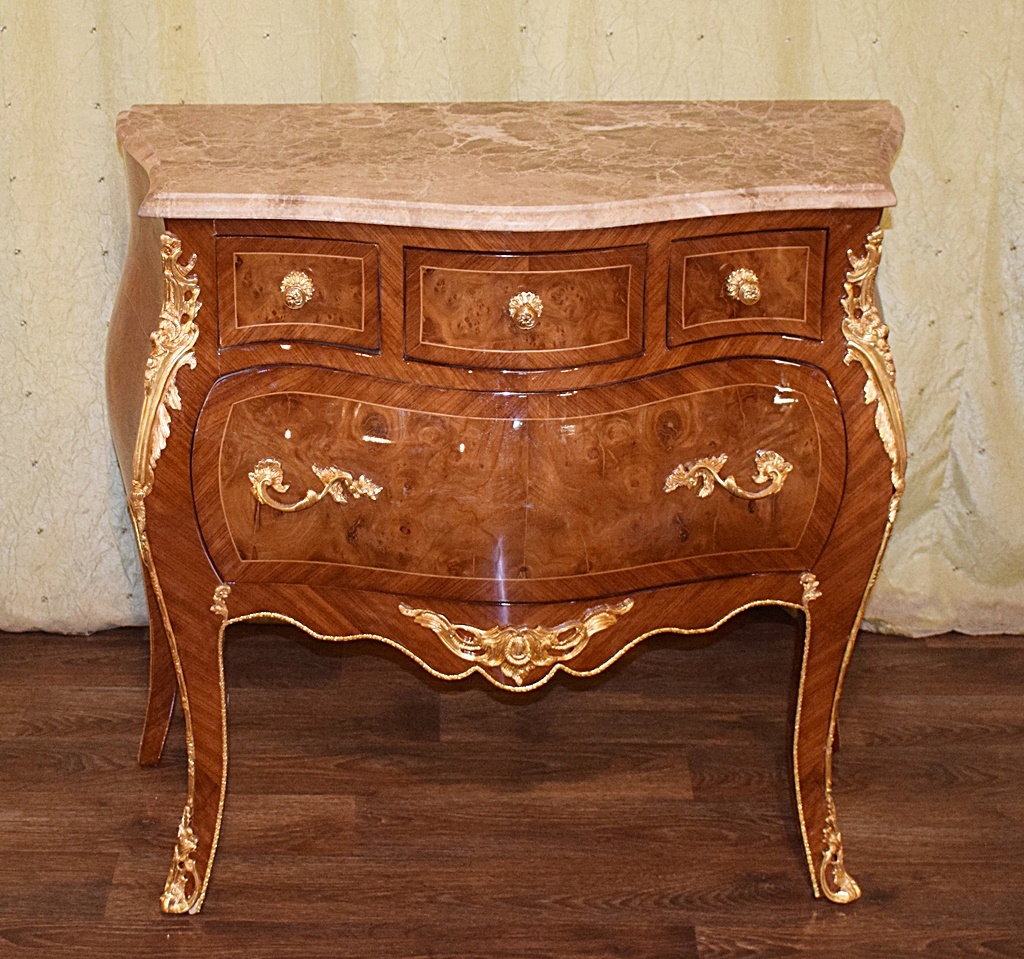 Современно выполнен из дерева в старинном стиле. Имеет три маленьких ящика и один большой, украшенный латунными ручками и декором, столешница выполнена из бежевого мрамора. Цвет предмета мебели – темный орех.