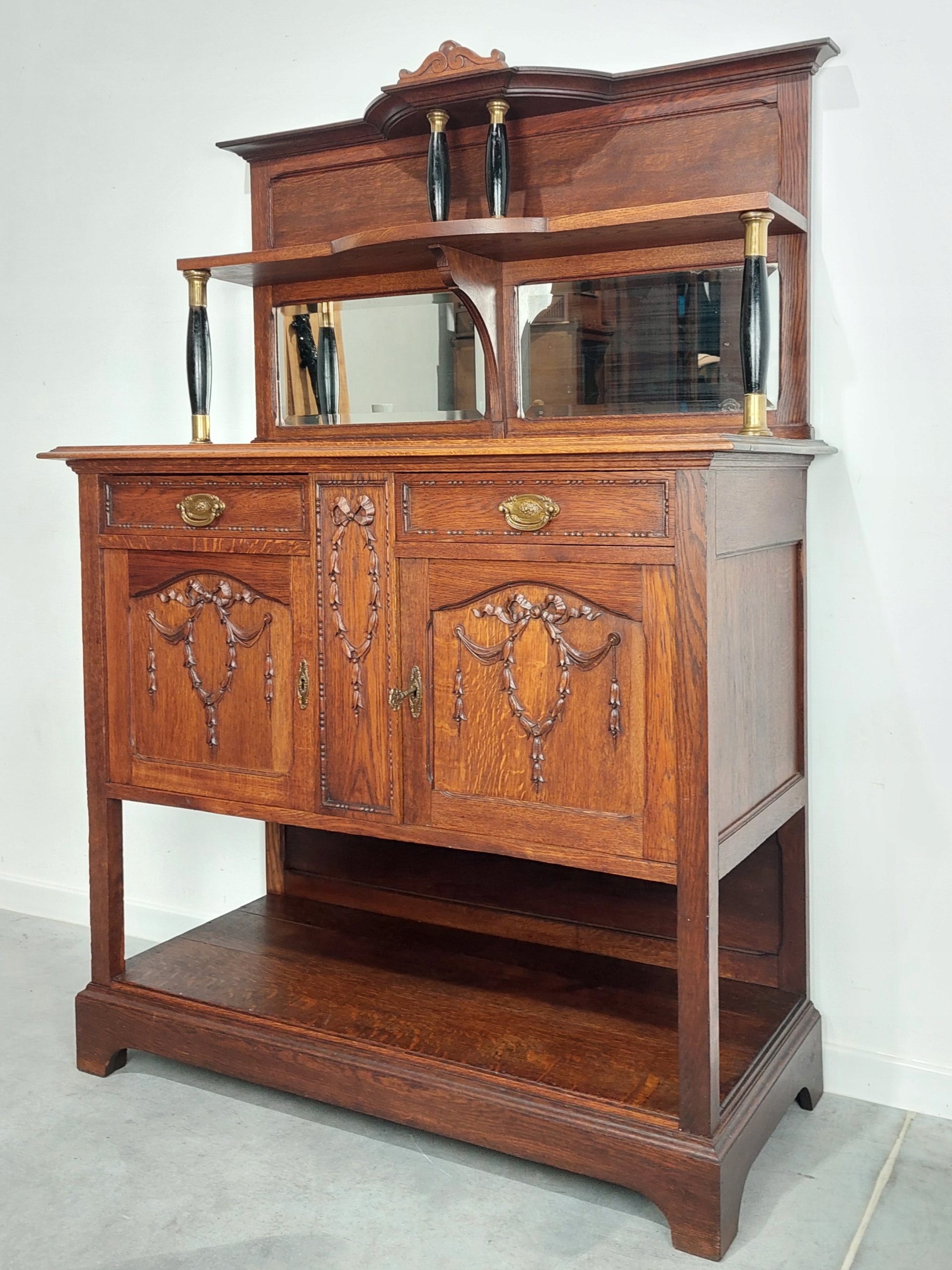Стильный дубовый комод - сервант в стиле модерн с зеркалом. Дата производства 1922 г. (есть идентификационный номер). Мебель из массива дуба, с красивой резьбой. На столешнице имеются следы использования: царапины и потертости. Замки на дверях работают, ключ в комплекте. Зеркало хрустальное, в хорошем состоянии. Мебель имеет следы использования (левая нижняя балясина сзади слегка повреждена) и из-за возраста может иметь следы ремонта. Зеркало с удлинителем для транспортировки разбирается. Подробности показаны на фотографиях ниже.
