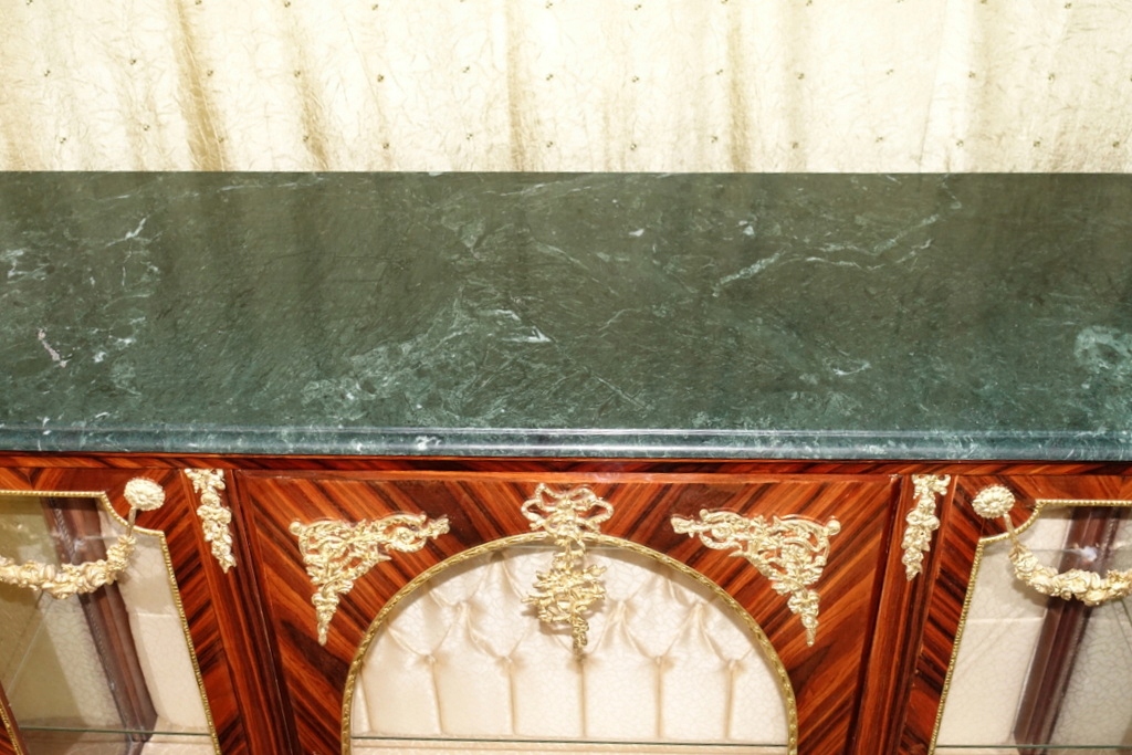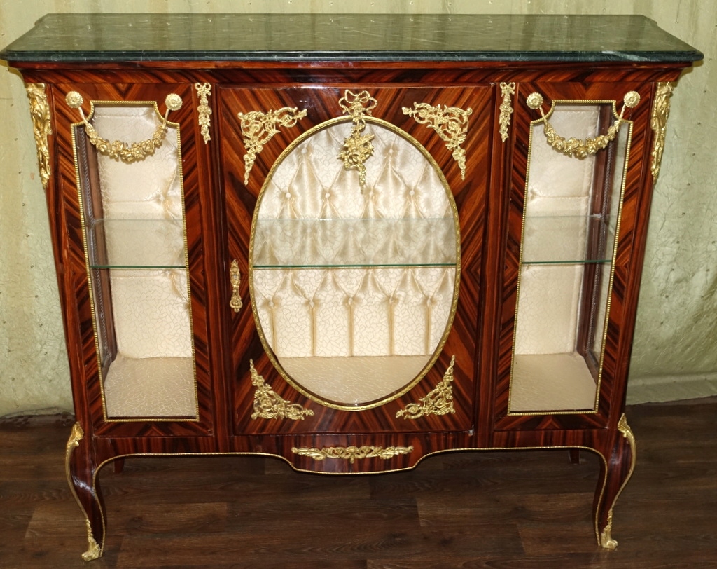 выставочный комод сайта h1> комод приготовлен новым в соответствии со старым дизайном дерева, а затем визуализирован темным цветом грецкого ореха. Грудь ящиков из мрамора в темно -зеленом оттенке. Украшение от полной латуни дает стиль и класс. Он имеет в середине двери, через которую мы имеем доступ к внутренней части разделенной половины стекла. Олделение с трех сторон позволяет демонстрировать отличные коллекции и экспонаты семейной коллекции. На спине и дне выстлана со вкусом материалом. Крупник ящиков уникален и единственный в своем роде !!! 124 см, длина 134 см, глубина 45 см, высота ноги 28 см .