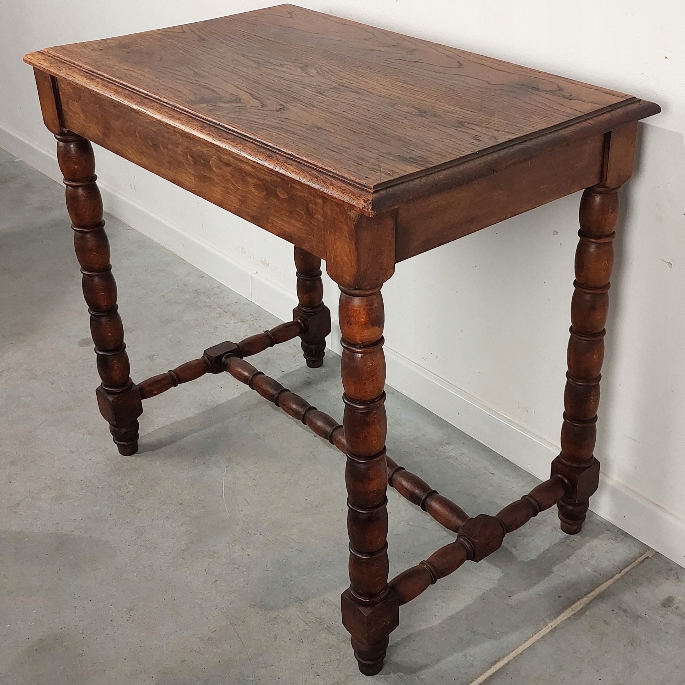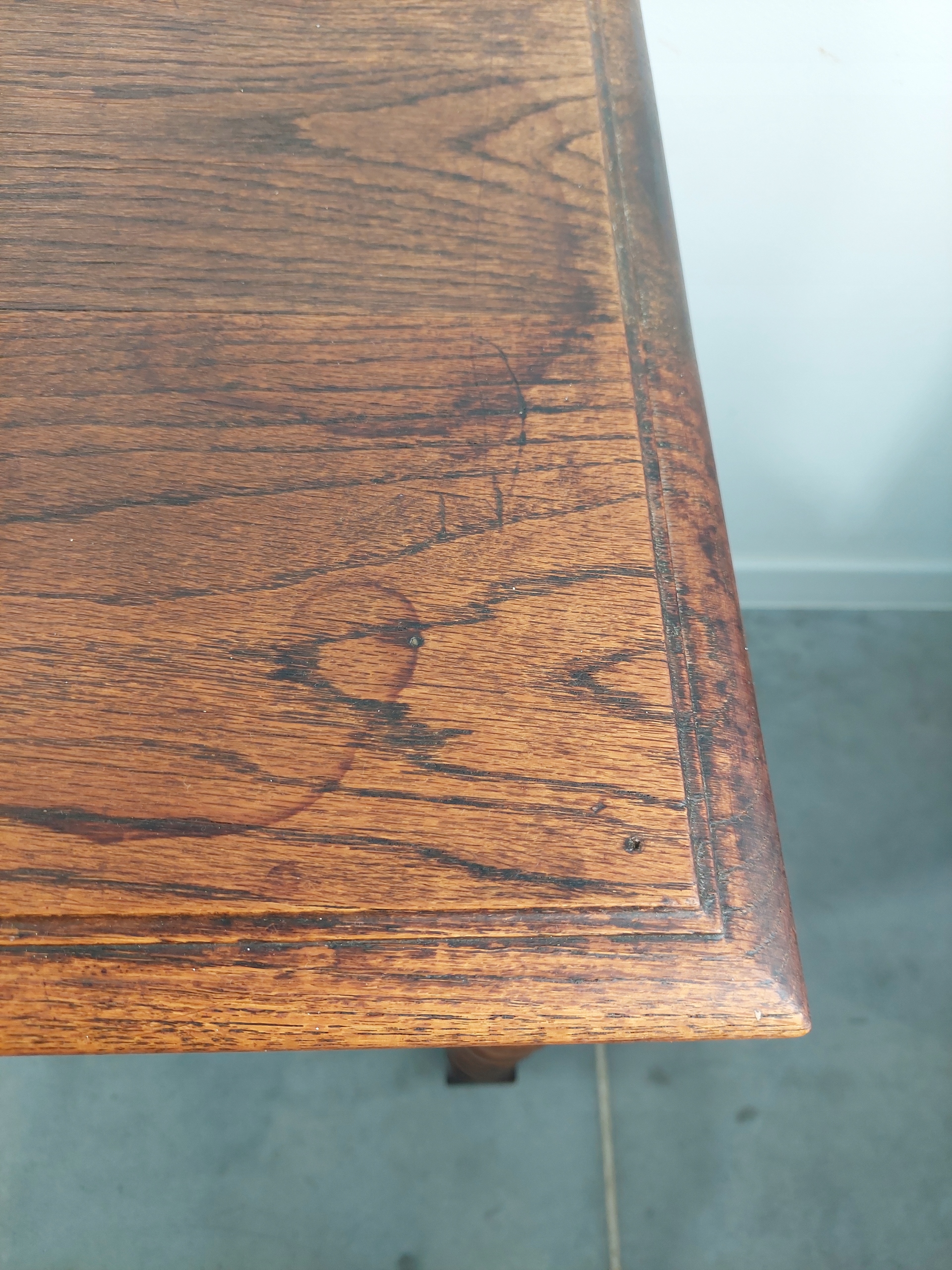 Стильный кухонный стол в деревенском стиле. Его можно использовать по-разному, его можно использовать как консоль, письменный стол, машинный стол и стол для маленькой кухни или кухни на участке. Мебель из массива дуба, на утолщенных точеных ножках. Столешница имеет типичные следы использования, такие как царапины, потертости и изменение цвета. Детали показаны на фотографиях ниже.