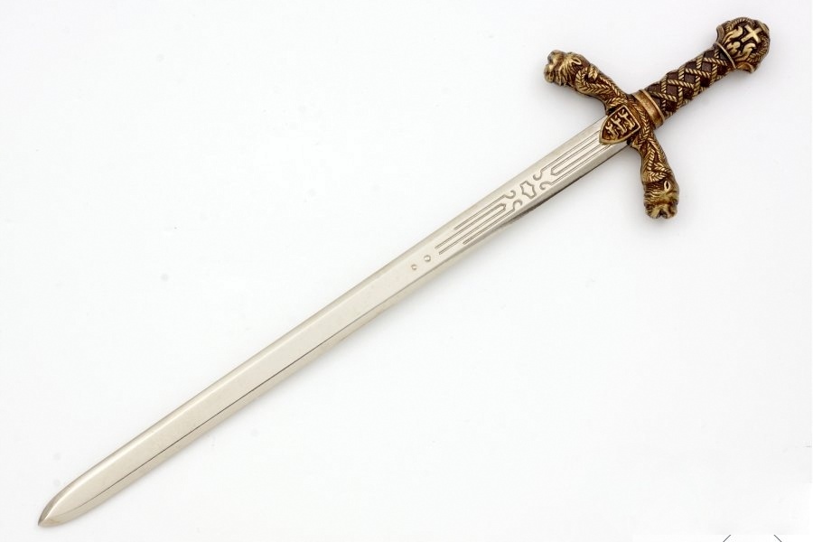 Металлическая копия меча. Современный продукт, очень эстетичный, созданный по образцу оригинальных экспонатов. Предназначен для открытия корреспонденции, а также в качестве украшения стола или коллекции.