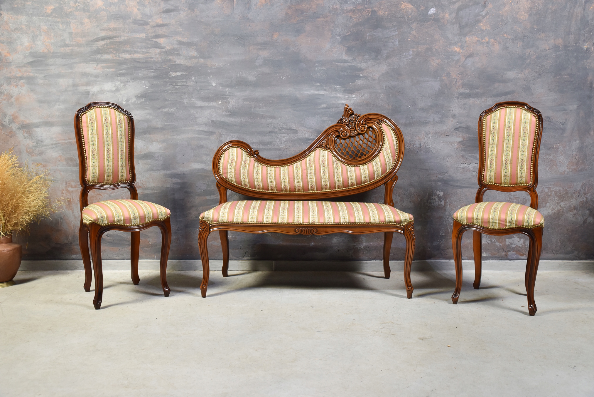 Комплект создан во второй половине 20 века. Конструкция изготовлена из массива ореха. Оригинальная обивка, сохранившаяся в хорошем состоянии.